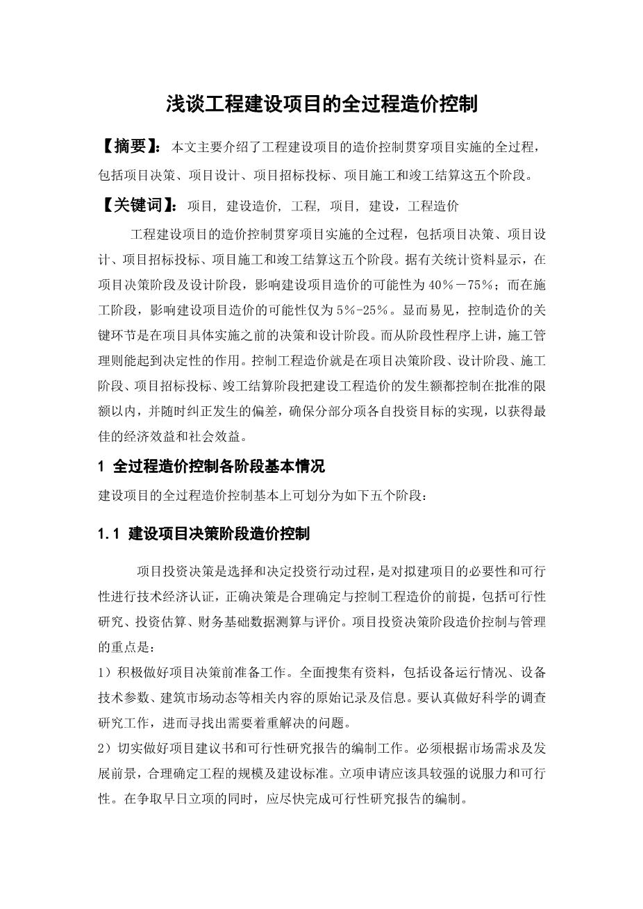 【Abstract】: This article mainly introduced the engineering project cost control throughout the whole process of project implementation, including project decision-making, project design, project bidding, project construction and completion of the settlement this five stages.