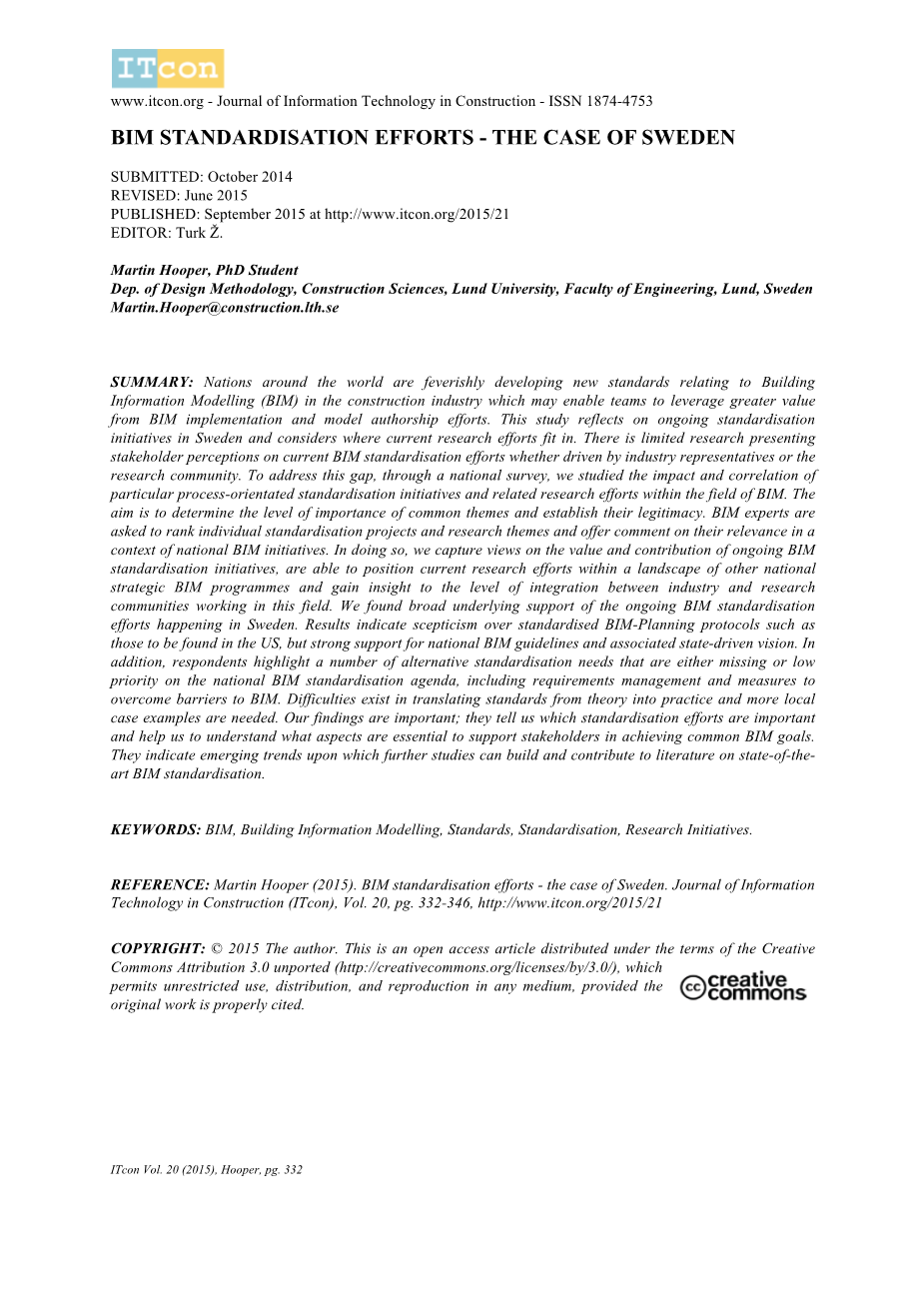 REFERENCE: Martin Hooper (2015). BIM standardisation efforts - the case of Sweden. Journal of Information Technology in Construction (ITcon), Vol. 20, pg. 332-346, http://www.itcon.org/2015/21