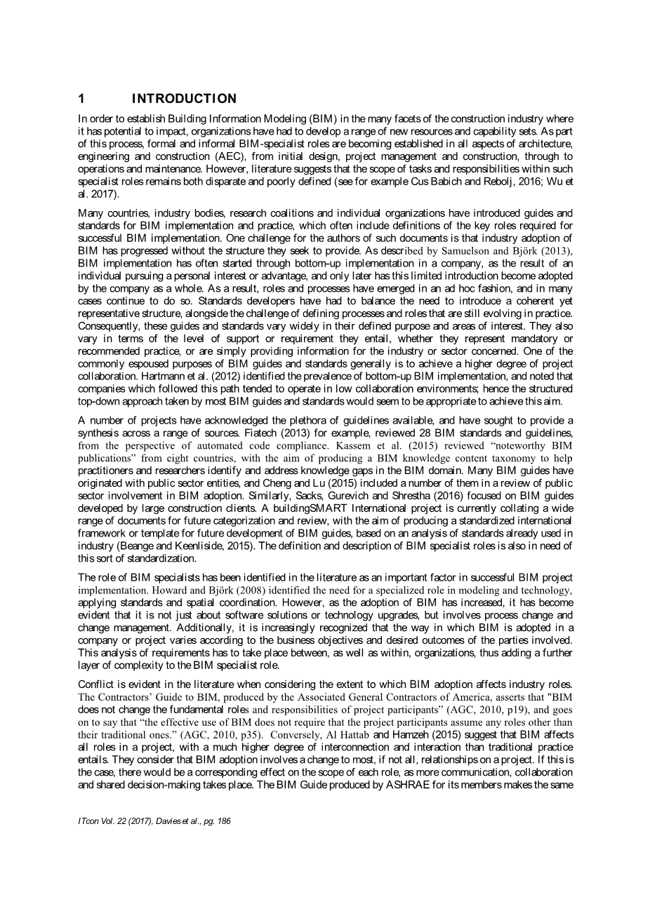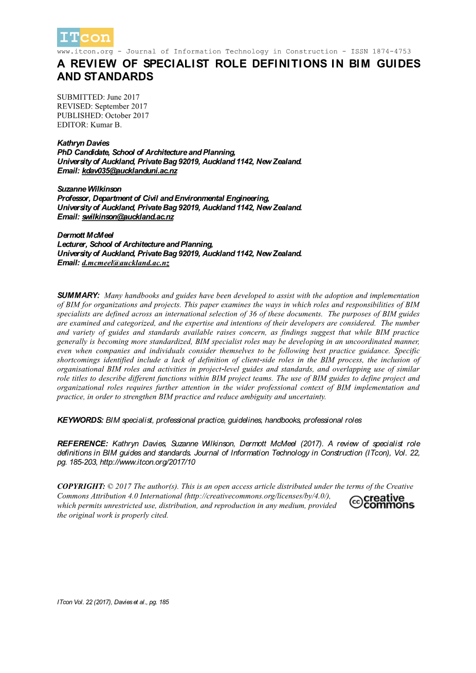 引文: Davies K,Wilkinson S,McMeel D(2017)。BIM指南和标准中的专家角色定义综述,ITcon Vol。22,pg。185-203,http://www.itcon.org/2017/10