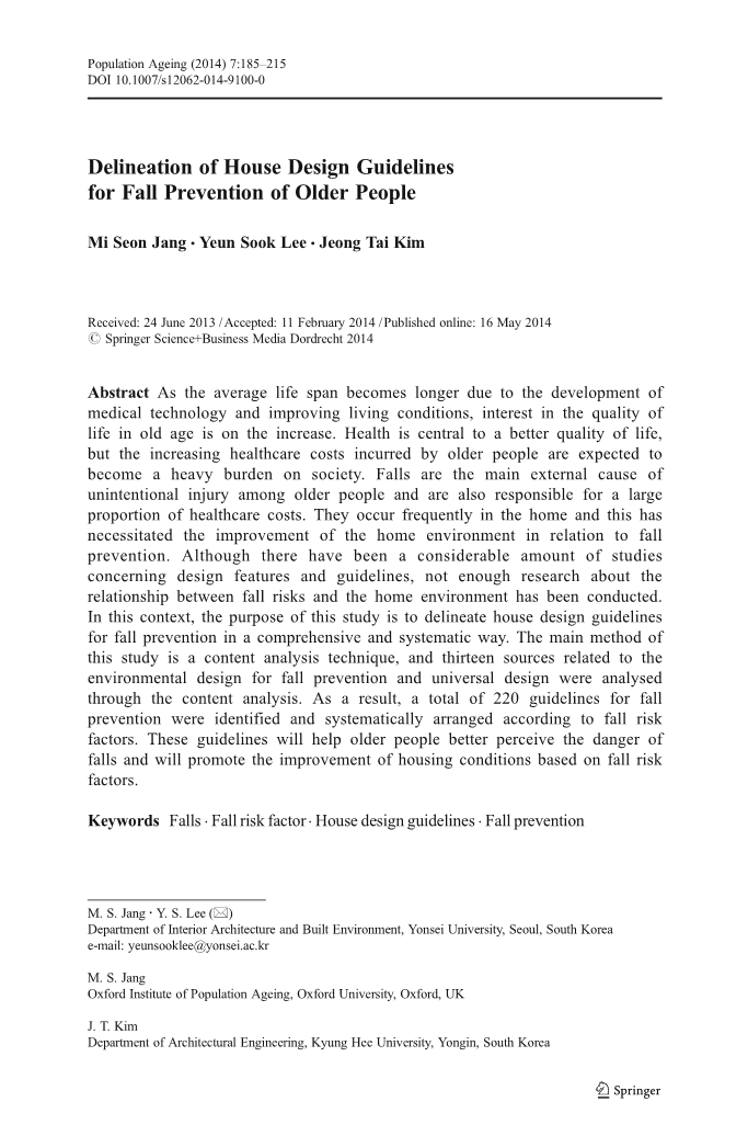 作为跌倒在老人之中经常发生在家 (韩国 2010统计数据), 大约一半可以通过改善居住环境来防止跌倒的发生 (KCPB 2011)。在以前许多关于跌倒的研究中, 提到了环境的重要性 (布莱克 1988;Prudham 和Evans 1981; Tinetti 1988; Downton和安德鲁 1991;克莱姆森2008;Shroyer 1996;迪纳和米切尔 2005) 和居家适老化设备和修改可以被用作是对预防跌倒最初的、辅助性的预防。 (卫生组织 2007;Clemsonetal。2008;Parkand Shroyer 1996;迪纳和米切尔 2005;Hendriks 2008;Elley 2008;Salminen 2009;NCIPC 2008;ACSQHC 2009;退休协会 2008;NRC 和 MHW 2008;托尔斯滕·马库斯和托尔斯滕·马库斯 2003;白南舜等 2002;卡明等 1999;FHWNU2007;玛格丽特等人 2001)。然而, 这类研究只涉及居住环境或基本水平的修改 (卫生组织 2007;克莱姆森等 2008;公园和 Shroyer 1996;迪纳和米切尔 2005;Hendriks 2008;艾里2008;Salminen 等 2009;NCIPC 2008;ACSQHC 2009;退休协会 2008;NRC 和 MHW 2008), 评估环境危害, 或在有限范围内进行务实的家庭修改 (托尔斯滕·马库斯和托尔斯滕·马库斯 2003;白南舜等 2002)。此外, 虽然其他研究涉及对不安全环境的评估或对预防跌倒环境的修改, 但它们是由职业治疗师进行的, 而不是由环境专家进行的。因此, 很难相信所有的家庭改造的特点被认为是彻底和全面的 (卡明等 1999;FHWNU 2007;玛格丽特等人 2001 27–29)。