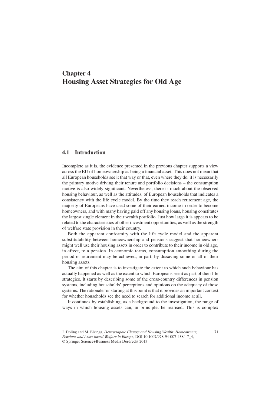 尽管不完整,但在前一章中提出的证据支持了欧盟的一种观点,即房屋所有权是一种金融资产。这并不意味着所有的欧洲家庭都这么认为,即使他们这样做,也必然是推动他们的任期和投资组合决策的主要动机——消费动机也非常重要。然而,观察到的住房行为以及欧洲家庭的态度,表明了与生命周期模型的一致性。当他们到了退休年龄时,大多数欧洲人已经用他们的部分收入来做房主,而且许多人已经还清了住房贷款,住房是他们财富组合中最大的单一因素。这似乎与其他投资机会的特点以及该国福利国家规定的强度有关。
