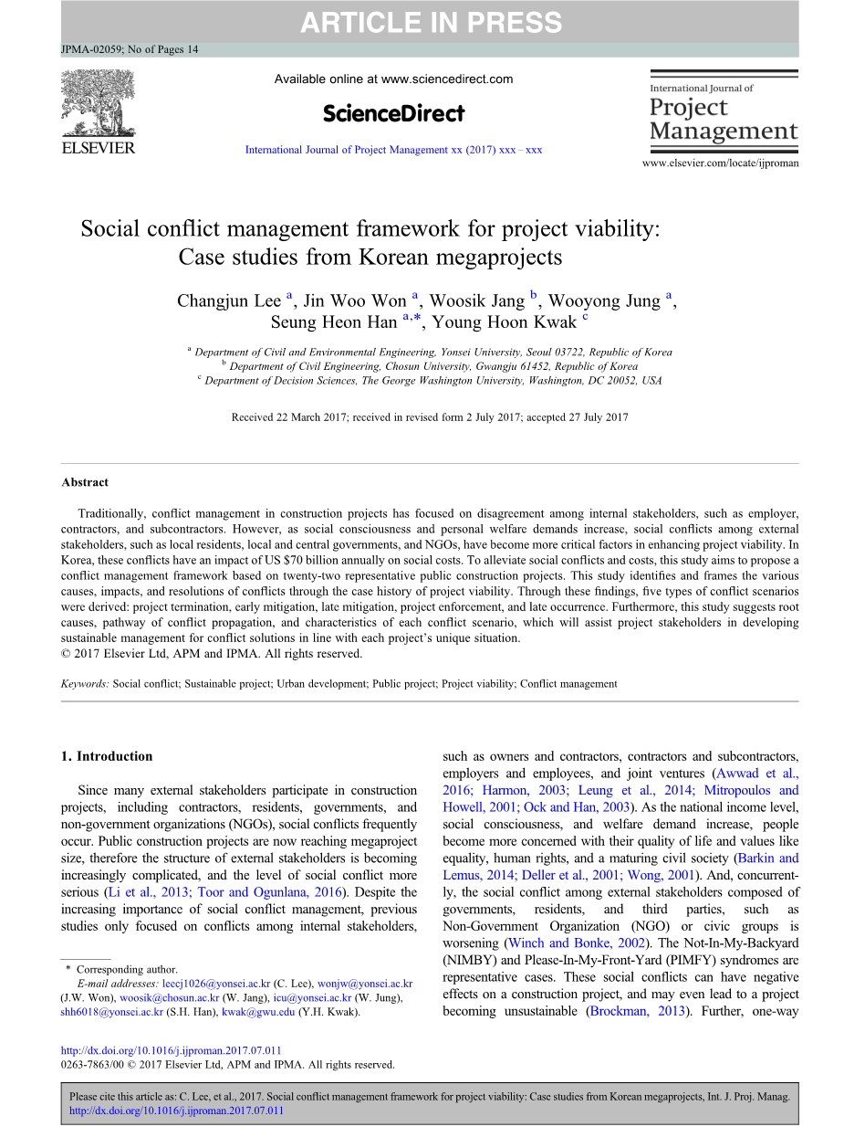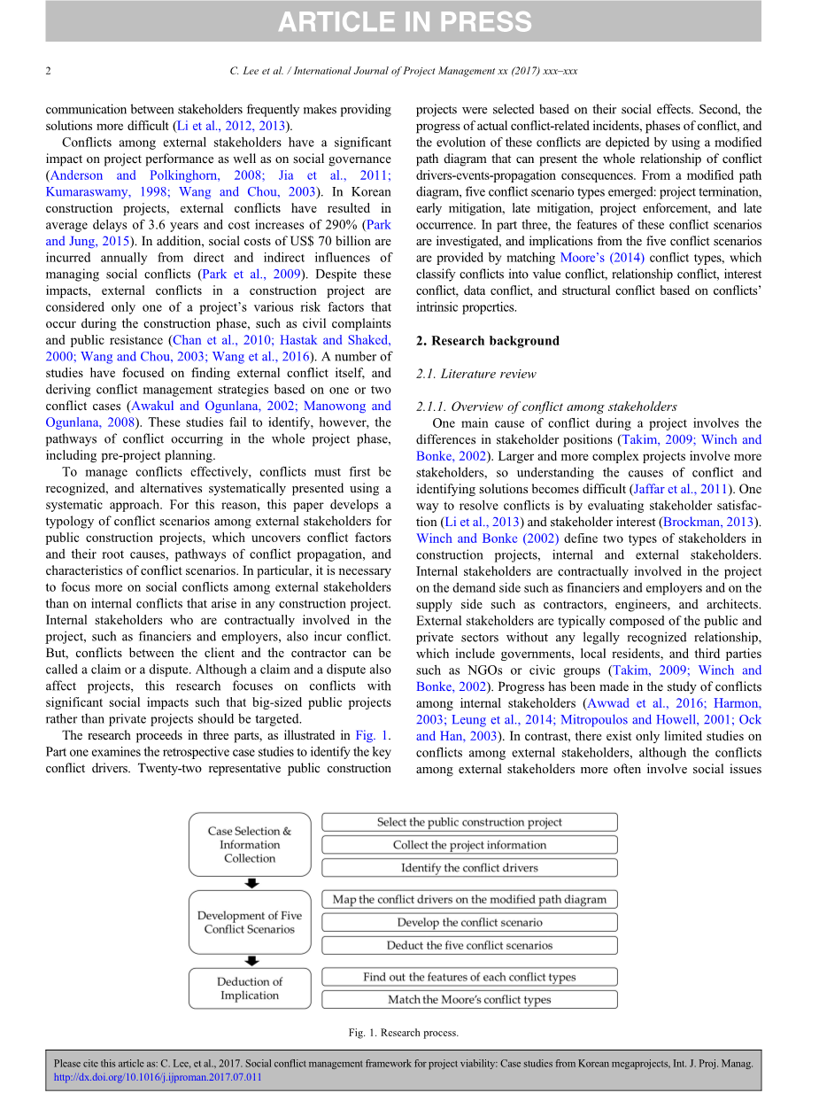 外部股东之间的冲突对项目绩效和社会治理有重大影响(Anderson and Polkinghorn, 2008;Jia等人.,2011;Kumaraswamy,1998;Wand and Chou,2003)。在韩国的建筑项目中,外部冲突导致平均延迟3.6年,成本增加了290% (Park and Jung, 2015)。此外,每年有700亿美元的社会成本来自于管理社会冲突的直接和间接影响(Park等人, 2009)。尽管有这些影响,在建设项目中,外部冲突只被认为是项目在建设阶段发生的各种风险因素之一,如民事投诉和公众阻力(Chan等人., 2010;Hastak and Shaked,2000;Wand and Chou,2003;Wang等人 .,2016)。许多研究都集中于寻找外部冲突本身,并根据一到两起冲突案例(Awakul and Ogunlana, 2002;Manowong Ogunlana,2008)。然而,这些研究未能确定整个项目阶段发生冲突的途径,包括项目前期规划。