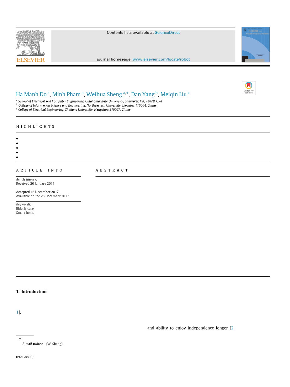 智能家居环境被定义为一个无处不在的计算应用程序,它能够为用户提供上下文感知辅助服务和家庭自动化。此外,智能家居为居民提供舒适、医疗和安全服务。另一方面,移动机器人近年来进入了人类环境。它们已在工厂、办公室、医院和家庭等许多地方使用。对于在自己居住的独立居住的老年人来说,家庭服务机器人可以作为为人类服务的工具、代表照顾者的化身以及与老年人合作和互动的社交伴侣。在机器人集成的智能家居(RiSH)中,家庭服务机器人可以像利用自己的传感器一样利用智能家居传感器网络,从而更好地帮助老年人并与远程护理人员协作。因此,RiSHs将是技术的完美运用,以实现在自己家中照顾老人的目标。