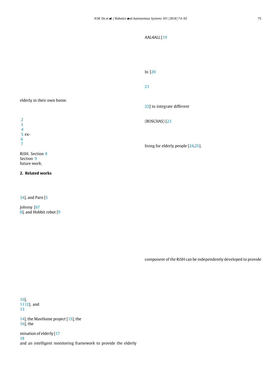 移动机器人最近通过无线通信被集成到几个智能家居中,但角色不同。在[20]中,索尼 AIBO 机器人用于在远程医疗系统中收集现场场景的图像和音频数据,用于健康和活动监测。物理嵌入式智能系统 (Pis-生态学) 框架[21]对待设备在机器人和设备在环境作为同一个系统的互连的组分。系统功能可以分配给机器人或环境中的设备。通用即插即用技术被引入[22],将不同的电子设备和监控机器人集成到智能家居中。机器人和云辅助医疗系统 (ROSCHAS) 的架构[23]旨在使机器人和智能家居能够为独居的老年人提供无处不在的医疗服务,尤其是精神保健服务。KSERA (知识渊博的 SErvice 机器人) 项目将一个社会机器人集成到智能家居环境中,以提高老年人独立生活的质量[24,25]。