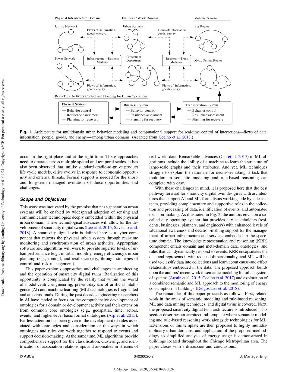 数字孪生的理想实现包括物理对象的模型,与对象存储的数据,个体对象之间的唯一一对一对应,以及监控和同步它们的状态和行为的能力(Shetty 2017)。智慧城市数字孪生体(Leeetal. 2015;Savisalo等人,2018)由于涉及物理、网络、社会和自然领域(图1和3)的众多问题,以及定义它们交互的语义和规则的困难,实现过程非常复杂。当对城市结构和行为的认识不完全,以及未来城市事件的空间和时间性质存在相当大的不确定性时,进一步的挑战就会出现。展望未来,智慧城市数字孪生体将需要应对这些挑战。作者建议,实现这一目的的一种方法是让他们在一个持续学习的过程中进行迭代,这个过程包括逐步细化语义模型和数据驱动的因果关系发现,以及参与领域元素之间的隐藏模式。这项工作的构建块是一个架构模板,它集成了语义建模和ML技术,并定义了它们的角色和交互。演示了如何扩展模板,使其包含真实城市中用于评估的数据源和度量的范围。