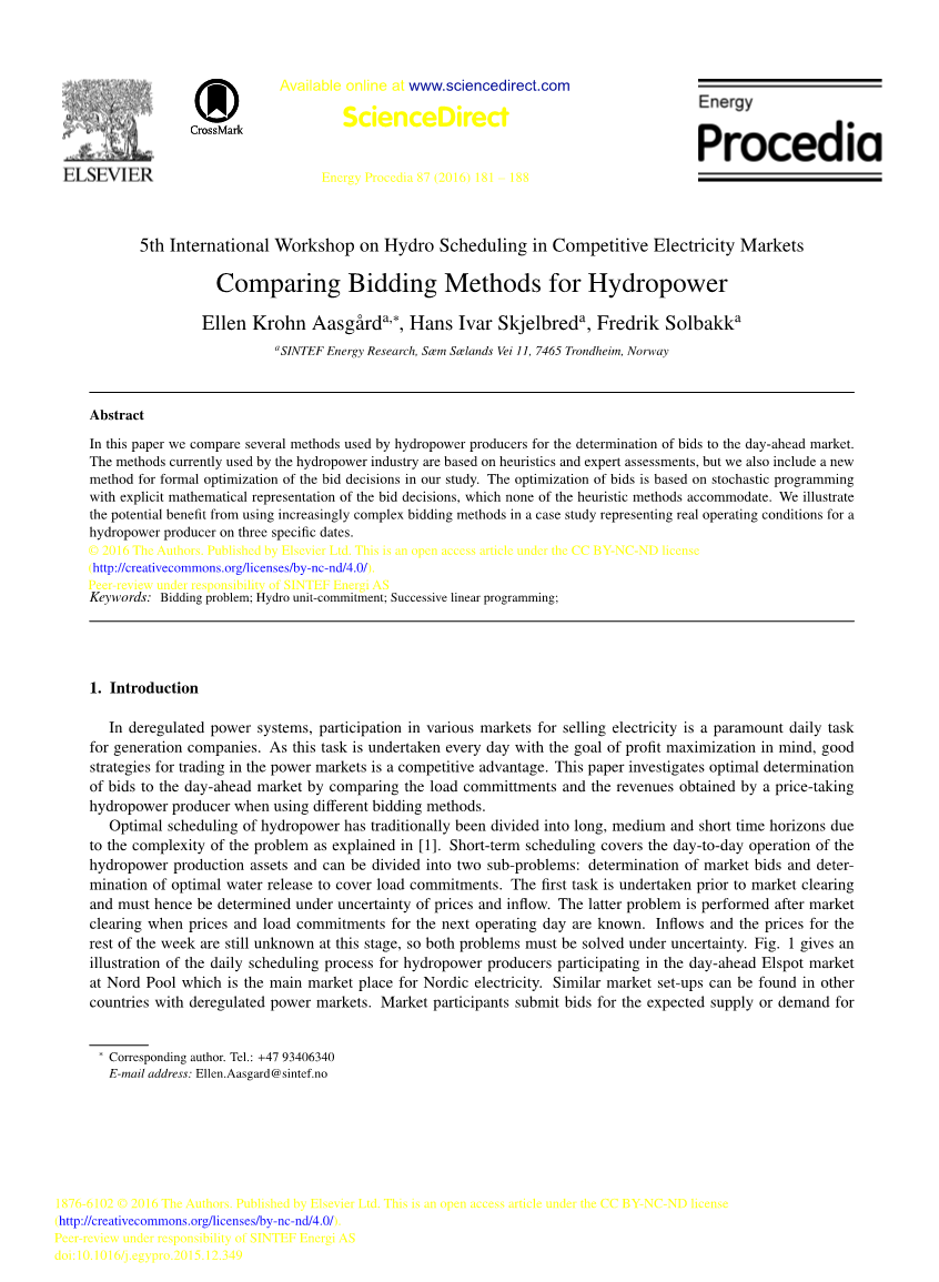 在本文中,我们比较了水电生产企业用于确定当日市场出价的几种方法。目前水电行业使用的方法都是基于启发式和专家评估的方法,但我们在研究中也加入了一种新的竞价决策形式优化方法。竞价的优化是基于随机编程,用明确的数学方法表示竞价决策,而启发式方法都不适应。我们在一个代表某水电生产商在三个特定日期的真实运行条件的案例研究中,说明了使用更加复杂的投标方法的潜在好处。