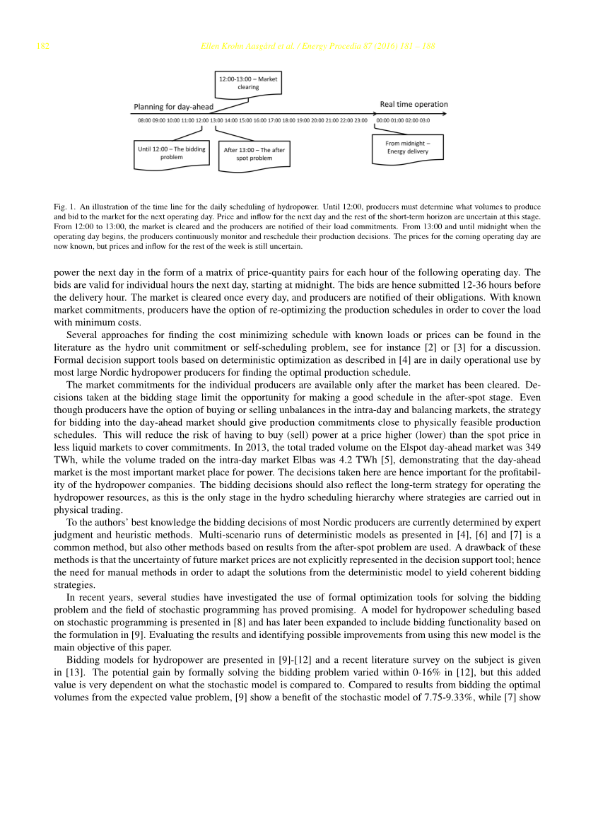据作者所知,大多数北欧生产商的投标决定目前是由专家判断和启发式方法决定的。如[4]、[6]和[7]中提出的确定性模型的多方案运行是一种常见的方法,但也使用了基于后点问题结果的其他方法。这些方法的一个缺点是,未来市场价格的不确定性没有在决策支持工具中明确体现出来;因此,需要采用人工方法,以调整确定性模型的解决方案,从而产生一致的投标策略。