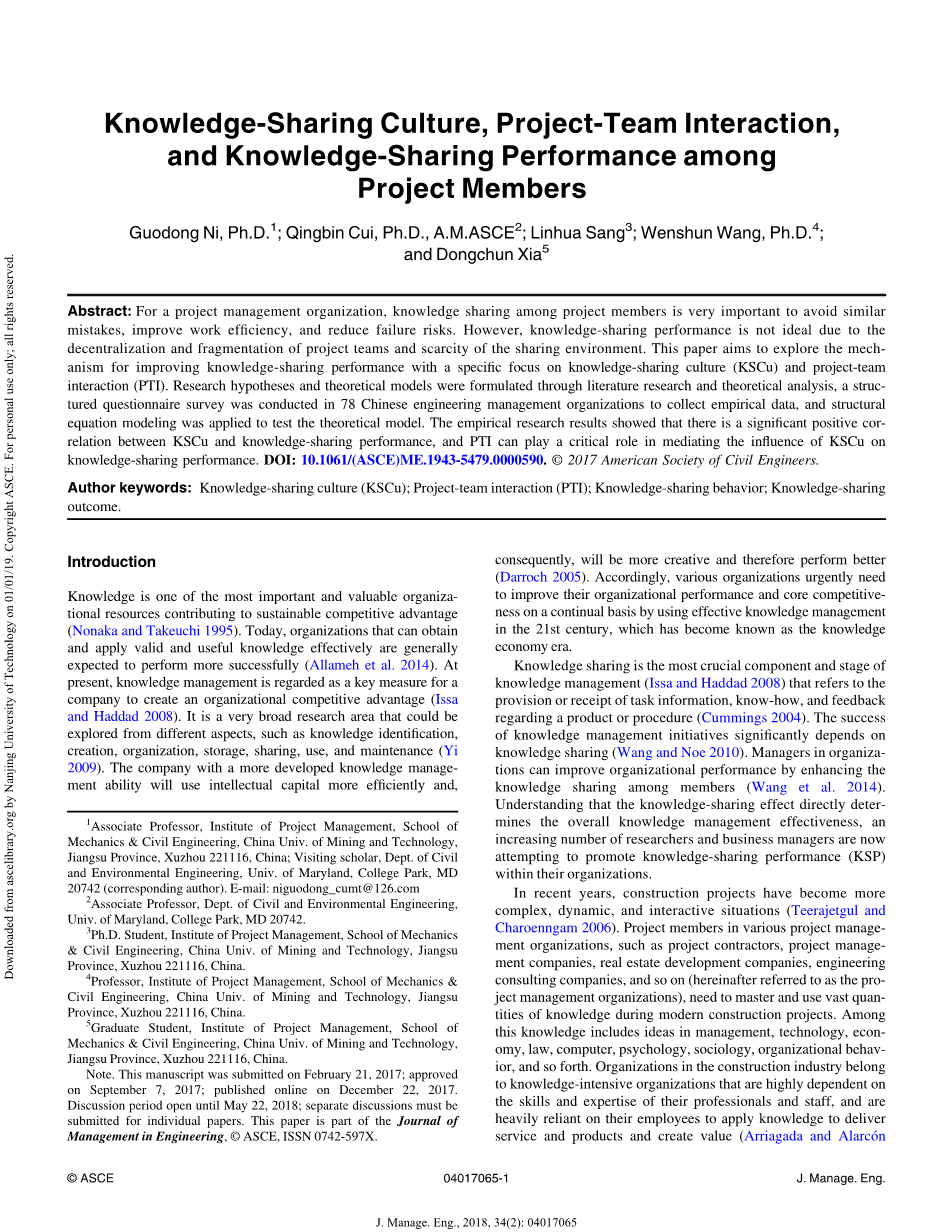 对于项目管理组织而言,项目成员之间的知识共享对于避免类似错误、提高工作效率、降低失败风险具有重要意义。然而,由于对象探讨了提高知识共享绩效的机制。通过文献研究和理论分析.提出研究假设和理论模型、对78家中国工程管理机构进行结构化问卷调查,收集实证数据,并运用结构方程模型对理论模型进行检验。实证结果表明,知识共享与知识共享之间存在显著的中介关系。内政部:101061/(ASCE)1943-5479.5902017美国土木工程师学会。