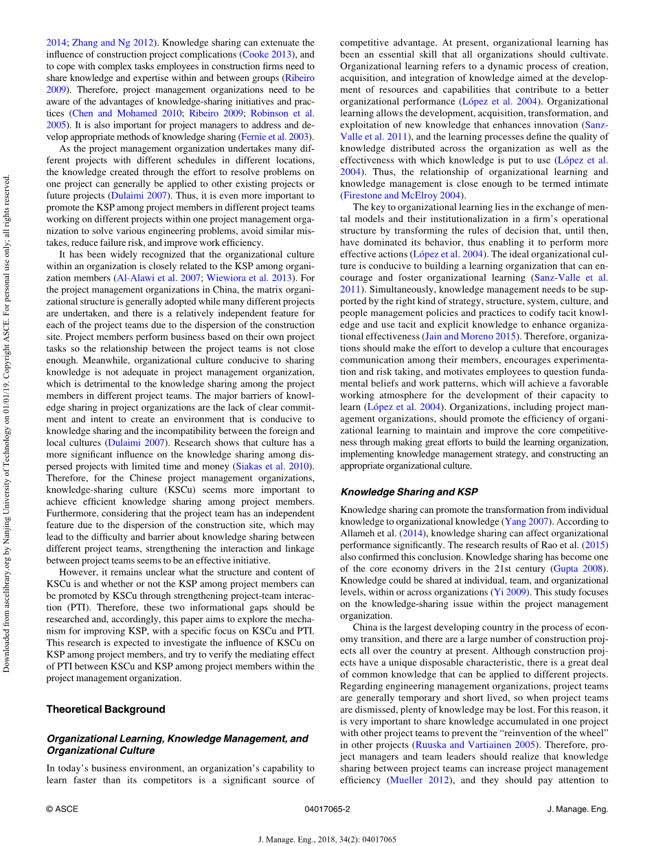 近年来,建筑项目变得更加复杂、动态和互动(Teerajetgul和Charoenngam 2006)。各种项目管理组织的项目成员,如项目承包商、项目管理公司、房地产开发公司、工程咨询公司等(以下简称项目管理组织),现代工程建设需要掌握和运用大量的知识。这些知识包括管理学、技术学、经济学、法学、计算机、心理学、社会学、组织行为学等。建筑业的组织属于知识密集型组织,高度依赖其专业人员和工作人员的技能和专业知识,严重依赖其员工应用知识提供服务和产品并创造价值(Arriagada和Alarcoacute;n)。2014;Zhang和Ng 2012)。知识共享可以减轻建筑项目复杂性的影响(Cooke 2013),为了应对复杂的任务,建筑公司的员工需要在团队内部和团队之间共享知识和专业知识(Ribeiro 2009)。因此,项目管理组织需要意识到知识共享倡议和实践的优势(Chen和Mohamed,2010年;Ribeiro,2009年;Robinson等人,2005年)。对于项目经理来说,解决和开发适当的知识共享方法也很重要(Fernie等人,2003)。