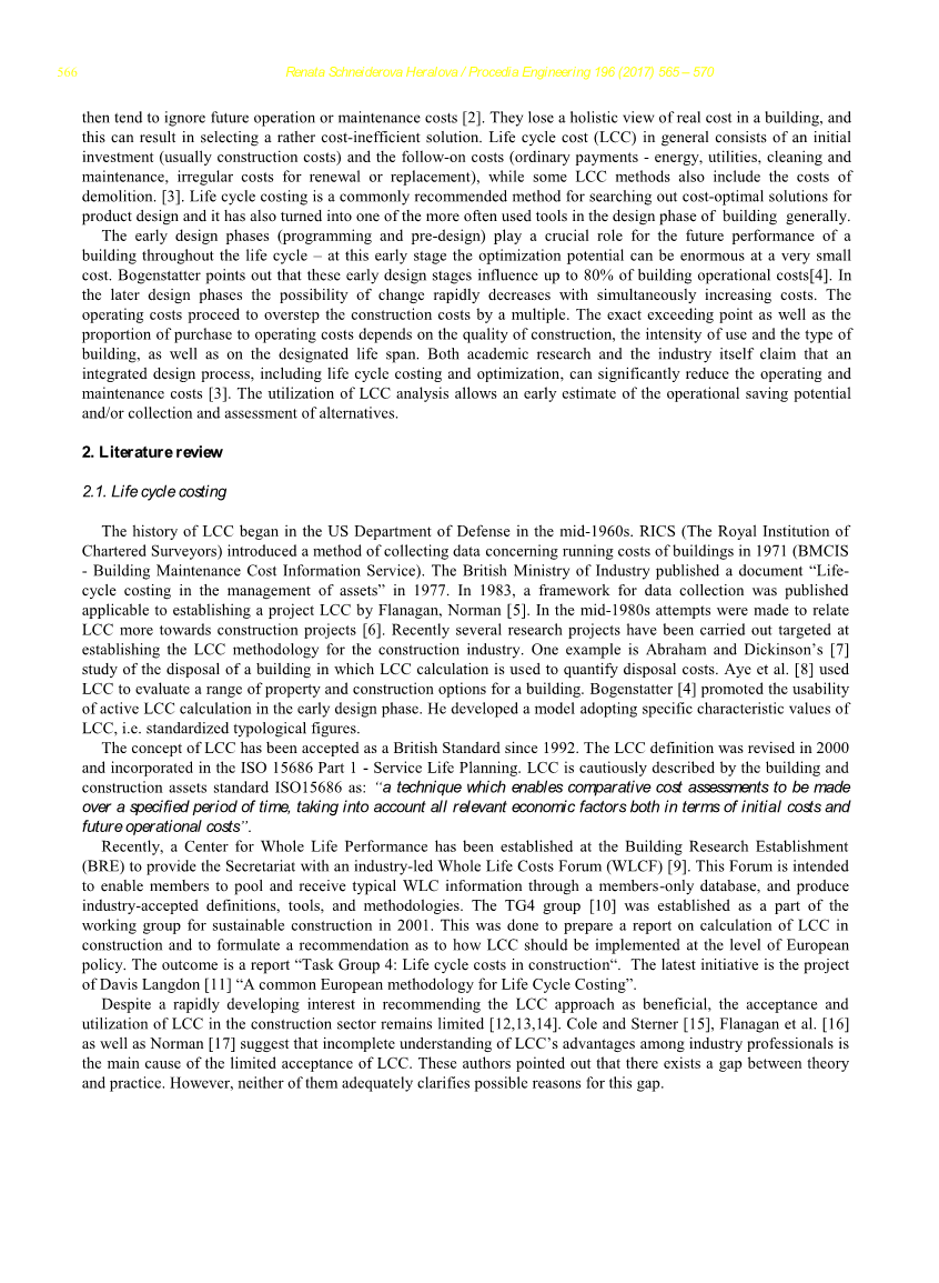 LCC的历史始于20世纪60年代中期的美国国防部。RICS(皇家特许测量师学会)介绍了一种收集1971年建筑物运营成本数据的方法(BMCIS-建筑维护成本信息服务)。英国工业部于1977年发布了一份文件“资产管理中的生命周期成本”。1983年Flanagan和Norman出版了一个适用于建立项目LCC的数据收集框架[5]。在20世纪80年代中期,人们试图将LCC更多地与建筑项目联系起来[6]。最近,已经开展了几个研究项目,旨在建立建筑业的LCC方法。其中一个例子是Abraham和Dickinson [7]对建筑物处置的研究,其中LCC计算用于量化处置成本。Aye等人[8]使用LCC评估建筑物的一系列财产和建筑选择。Bogenstatter [4]在早期设计阶段提升了主动LCC计算的可用性。他开发了一个采用LCC特定特征值的模型,即标准化的类型学数据。