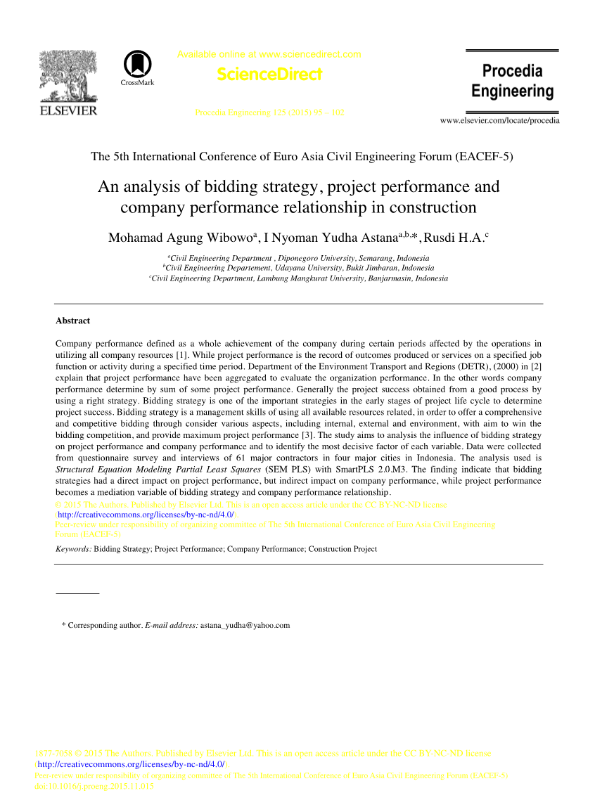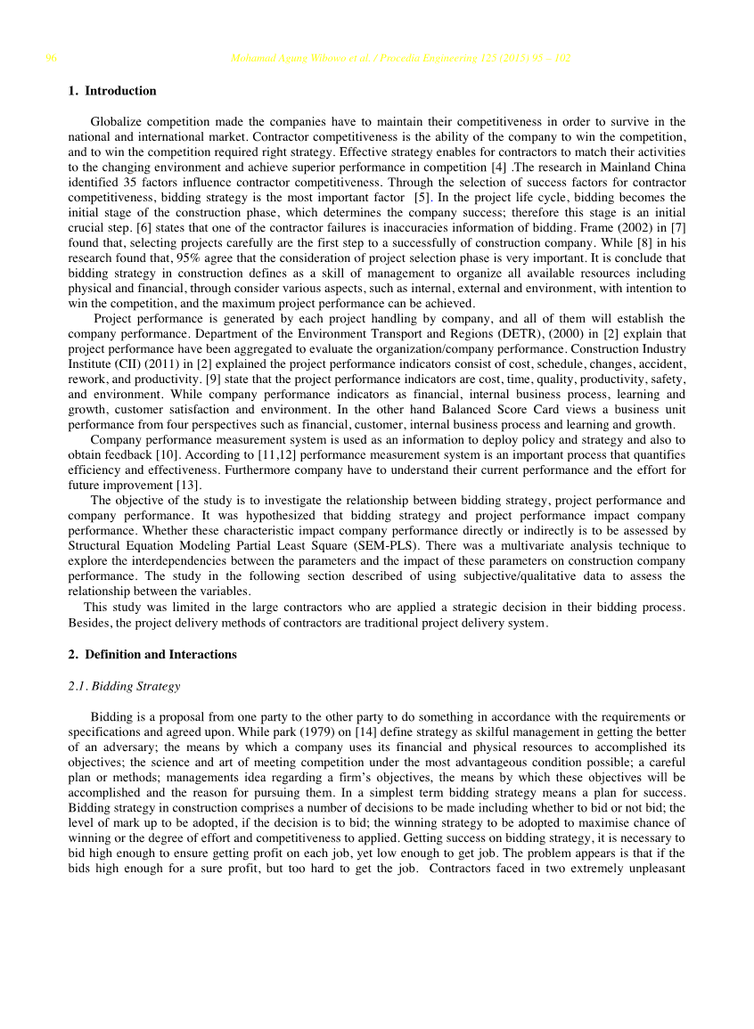 公司绩效定义为在一定时期内公司在利用所有公司资源的过程中受经营影响的整体成就[1]。项目绩效是在特定时间段内在特定工作职能或活动上产生的成果或服务的记录。环境运输和地区局(DETR),(2000)在[2]中解释说,该项目绩效已被汇总以评估组织绩效。换句话说,公司绩效取决于某些项目绩效的总和。通常,通过使用正确的策略从一个好的过程中获得项目成功。投标策略是项目生命周期早期确定项目成功的重要策略之一。投标策略是一种利用所有相关资源的管理技巧,旨在通过考虑内部,外部和环境等各个方面来提供全面而具有竞争力的投标,以赢得投标竞争并提供最大的项目绩效[3] 。该研究旨在分析投标策略对项目绩效和公司绩效的影响,并确定每个变量的最具决定性因素。数据来自问卷调查和印度尼西亚四个主要城市的 61 个主要承包商的访谈。使用的分析是带有 SmartPLS 2.0.M3 的偏最小二乘的结构方程模型(SEM PLS)。该发现表明,投标策略对项目绩效具有直接影响,但对公司绩效具有间接影响,而项目绩效则成为投标策略与公司绩效关系的中介变量。