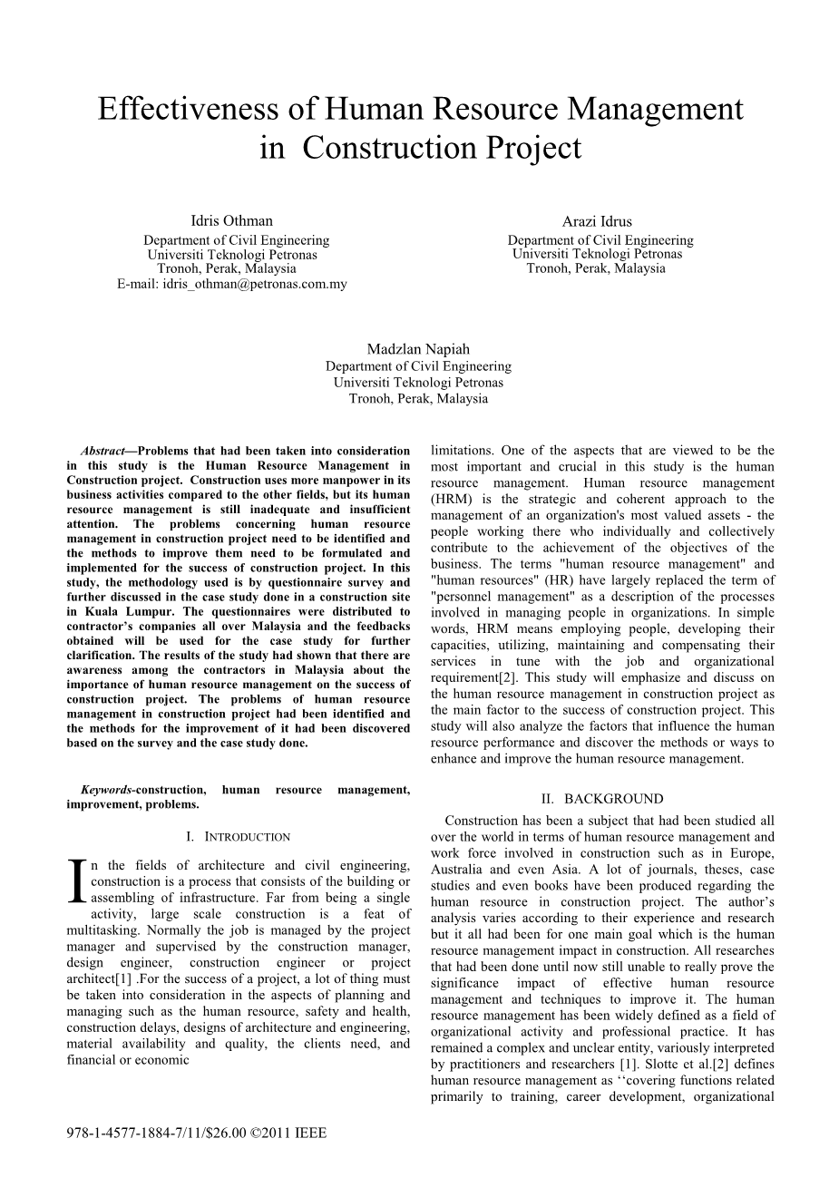 在建筑和土木工程领域,建筑是一个由基础设施的建造或组装组成的过程。大规模建设远不是一项单一的活动,而是一项多任务的壮举。通常情况下,该工作由项目经理管理,由施工经理、设计工程师、施工工程师或项目建筑师监督[1],为了一个项目的成功,在规划和管理方面必须考虑很多因素,如人力资源、安全卫生、施工延误、设计建筑和工程的GNS、材料可用性和质量、客户需求以及财务或经济限制。人力资源管理是本研究中最重要和最关键的方面之一。人力资源管理(HRM)是一个组织最有价值的资产管理的战略和一致的方法——在那里工作的人,他们个人和集体为实现企业目标做出贡献。术语“人力资源管理”和“人力资源”(HR)在很大程度上取代了术语“人事管理”,作为对组织人员管理过程的描述。简而言之,人力资源管理是指雇佣员工,发展他们的能力,利用、维护和补偿他们的服务,使之与工作和组织要求相协调[2]。本研究将着重探讨建设项目人力资源管理作为建设项目成功的主要因素。本研究还将分析影响人力资源绩效的因素,找出加强和改进人力资源管理的方法和途径。