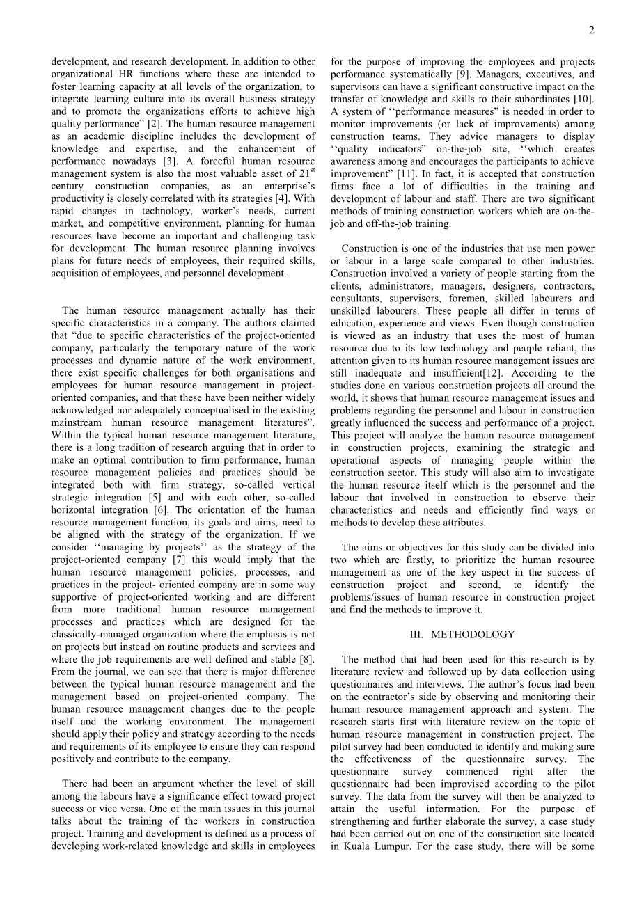 与其他行业相比,建筑业是一个大规模使用人力或劳动力的行业。施工涉及到从客户、管理人员、经理、设计师、承包商、顾问、监理、工头、熟练工人和非熟练工人开始的各种人员。这些人在教育、经验和观点上都各不相同。尽管建筑业被认为是一个技术含量低、人员依赖性强、人力资源利用率最高的行业,但对其人力资源管理问题的关注仍然不够充分[12]。根据对世界各地各类建设项目的研究,人力资源管理问题和施工中的人员和劳动力问题对项目的成功和绩效影响很大。本项目将分析建筑项目的人力资源管理,检查建筑部门人员管理的战略和运营方面。本研究亦旨在探讨人力资源本身,即建筑业所涉及的人员及劳工,以观察其特性及需求,并有效地找到发展这些特性的方法或方法。