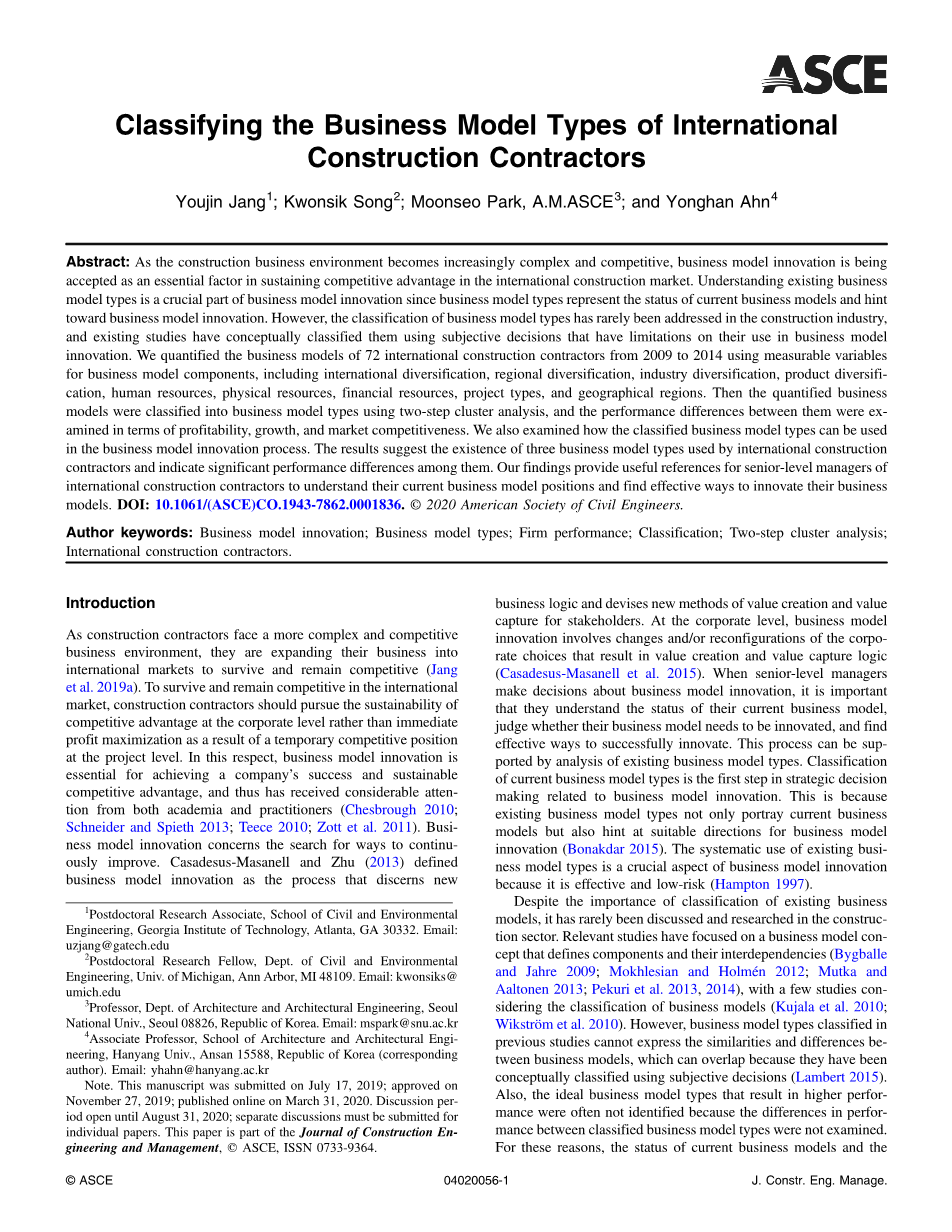 摘要:随着建筑业经营环境的日益复杂和竞争的日益激烈,商业模式创新被认为是维持国际建筑市场竞争优势的重要因素。了解现有的商业模式类型是商业模式创新的关键环节,因为商业模式类型代表了当前商业模式的现状,也是商业模式创新的提示。然而,建筑业很少涉及商业模式类型的分类,现有的研究对商业模式类型的分类采用主观决定的概念,在商业模式创新中的应用存在局限性。我们对2009年至2014年72家国际建筑承包商的商业模式进行了量化,采用可测量的商业模式成分变量,包括国际多元化、区域多元化、行业多元化、产品多元化、人力资源、物力资源、财力资源、项目类型和地理区域。然后采用两步聚类分析法将量化后的商业模式划分为商业模式类型,并从盈利性、成长性、市场竞争力等方面对它们之间的绩效差异进行了分析。我们还研究了分类后的商业模式类型如何在商业模式创新过程中使用。结果表明,国际建筑承包商使用的商业模式类型有三种,并表明它们之间存在显著的绩效差异。我们的研究结果为国际建筑承包商的高层管理者了解其当前的商业模式定位,寻找商业模式创新的有效途径提供了有益的参考。DOI: 10.1061/(ASCE)CO.1943-7862.0001836.copy; 2020 美国土木工程师协会。