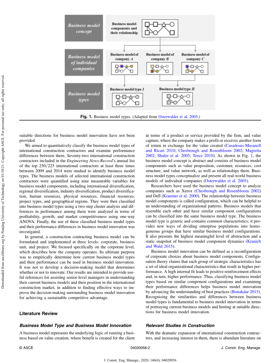 随着建筑承包商面临更加复杂和竞争激烈的商业环境,他们正在将业务扩展到国际市场,以生存和保持竞争力(Jang等,2019a)。为了在国际市场上生存并保持竞争力,建筑承包商应该在公司层面追求竞争优势的可持续性,而不是因为在项目层面的暂时竞争地位而立即实现利润最大化。在这方面,商业模式创新对于实现公司的成功和可持续竞争优势至关重要,因此受到了学术界和从业者的高度关注(Chesbrough,2010;Schneider和Spieth,2013;Teece,2010;Zott等,2011)。Busi- ness模式创新关注的是寻找持续改进的方法。Casadesus-Masanell和Zhu(2013)将商业模式创新定义为:发现新的商业模式的过程并为利益相关者设计新的价值创造和价值获取方法。在企业层面上,商业模式创新涉及到企业率选择的变化和/或重构,从而形成价值创造和价值获取逻辑(Casadesus-Masanell等,2015)。高层管理者在进行商业模式创新决策时,必须了解当前商业模式的现状,判断商业模式是否需要创新,并找到成功创新的有效途径。这一过程可以通过对现有商业模式类型的分析来进行超前判断。对现有商业模式类型进行分类,是商业模式创新相关战略决策的第一步。这是因为现有的商业模式类型不仅描绘了当前的商业模式,而且提示了商业模式创新的合适方向(Bonakdar,2015)。系统地利用现有的商业模式类型是商业模式创新的一个重要方面,因为它是有效的、低风险的(Hampton,1997)。
