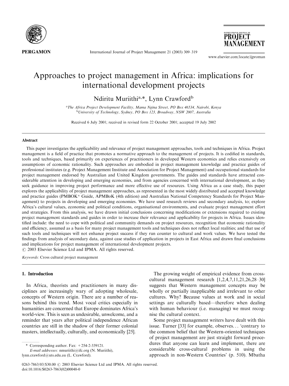 本文件调查了项目管理办法、工具和技术在非洲的适用性和相关性。项目管理是一个实践领域,促进以规范的方式管理项目。它主要根据西方发达经济体从业人员的经验编纂成标准、工具和技术,并广泛依赖于经济合理性的假设。这些方法体现在专业机构(如项目管理研究所和项目管理协会)的项目管理知识和实践指南以及澳大利亚和联合王国政府认可的项目管理职业标准中。指南和标准在发展中经济体和新兴经济体以及关心国际发展的机构中引起了相当大的关注,因为它们寻求改善项目业绩和更有效地利用资源方面的指导。本文以非洲为例,探讨最广泛分发和接受的知识和实践指南(PMBOK1、APMBOK(4th edition)和澳大利亚国家项目管理能力标准)所代表的项目管理方法对发展中经济体和新兴经济体项目的适用性。我们采用了研究综述和二次分析的方法;探索非洲的文化价值观、经济和政治条件、组织环境,并评估项目管理的方式和战略。从这一分析中,我们得出了关于修改或延长现有项目管理标准和指南的初步结论,以提高其对非洲项目的相关性和适用性。确定的问题包括:必须应付政治和社区对项目资源的要求,认识到许多项目管理工具和技术所假定的经济合理性和效率并不反映当地的现实;而且如果使用这些工具和技术违背文化和工作价值观,就不会提高项目的成功。我们将二级数据分析的结果与东非项目应用的个案研究进行了检验,得出了最后结论,并对国际发展项目的项目管理产生了影响。