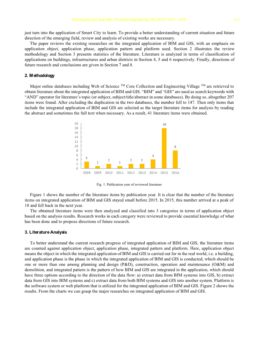 图1显示了按出版年份划分的文献条目的数量。可见,2015年前BIM与GIS集成应用的文献项目较少。2015年,这一数字达到18的峰值,并在第二年回落。