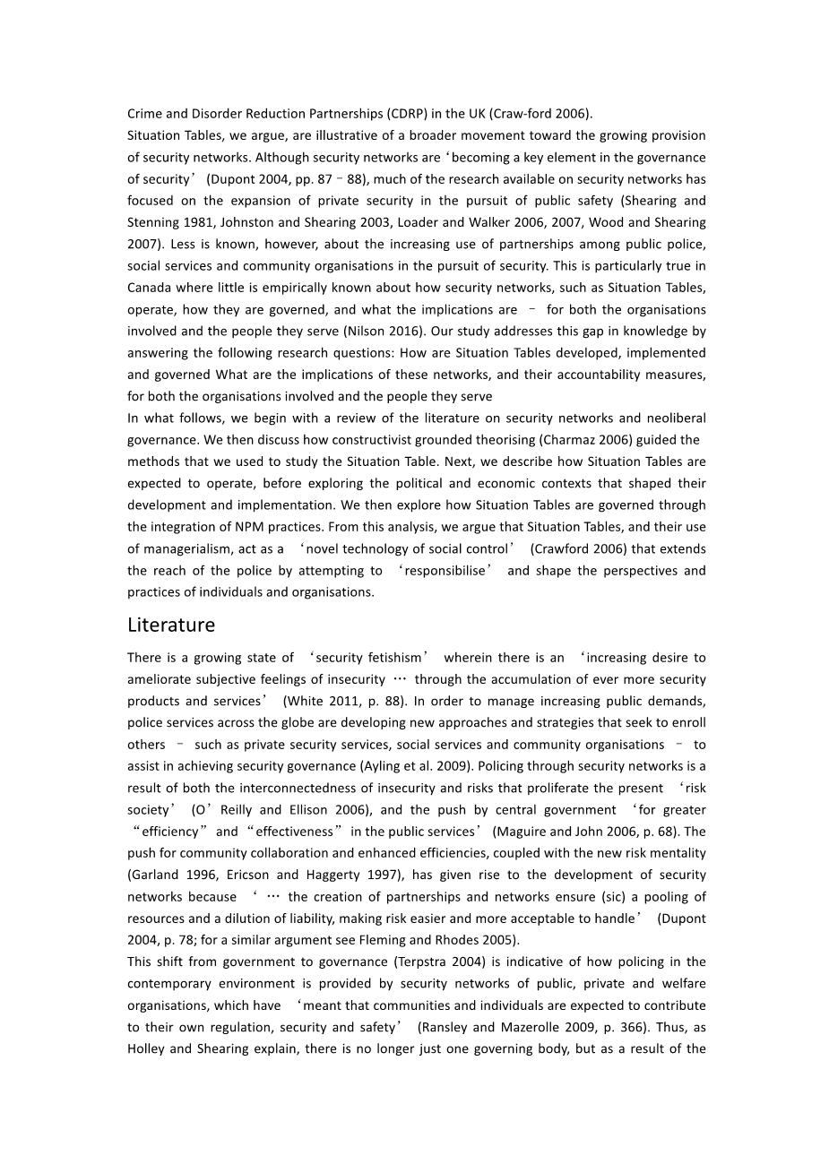 虽然对于国家在安全网络中所扮演的角色存在分歧,但现有的研究确定了新自由主义价值观在这种治理形式中的中心地位。正如Terpstra(2008,第2页)所指出的那样,多元警察制度是建立在“对新自由主义的许多价值观的可靠性的信念”的基础上的hellip;hellip;[以及这样一种信念],即当治理依赖于地方知识和能力时,它才能得到最好的实施。因此,预防犯罪和犯罪行为成为许多人的责任,因此需要一种国家管理和合作的办法。这种新自由主义技术是远距离治理的一个例证(Hannah-Moffat 2005)。