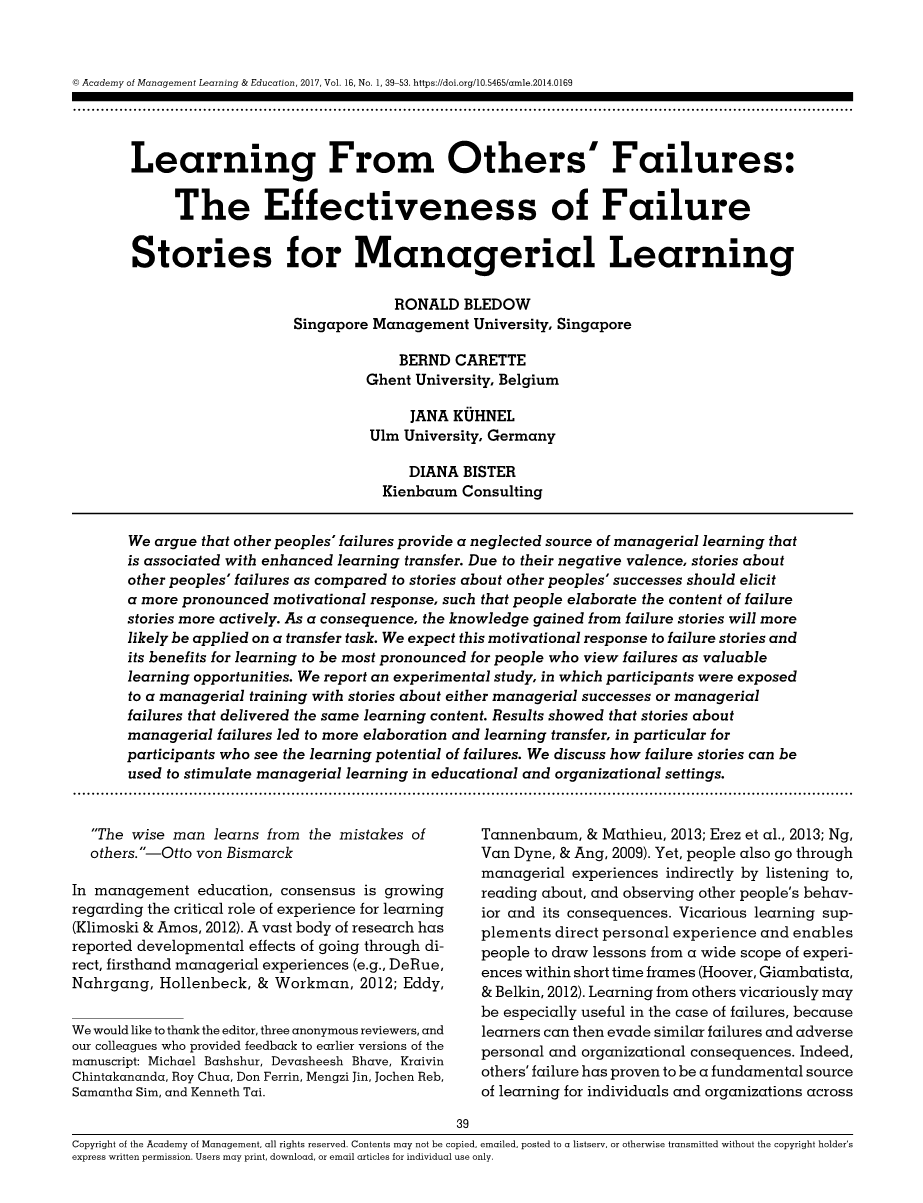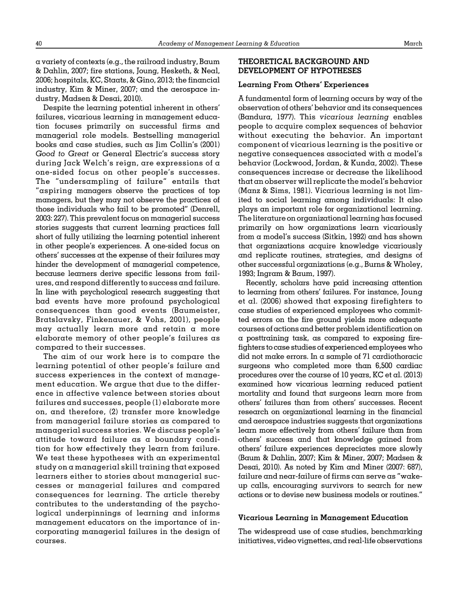在管理教育中,关于从经验中学习的关键作用的共识正在增长(Klimoski amp; Amos, 2012)。大量的研究指出直接的、第一手的管理经验对发展的影响(e.g., DeRue, Nahrgang, Hollenbeck, amp; Workman, 2012; Eddy, Tannenbaum, amp; Mathieu, 2013; Erez et al., 2013; Ng, Van Dyne, amp; Ang, 2009)。然而,人们也通过倾听、阅读和观察他人的行为及其后果来间接地经历管理经验。替代性学习补充了直接的个人经验,使人们能够在短时间内从广泛的经验中吸取教训(Hoover, Giambatista, amp; Belkin, 2012)。在失败的情况下,向他人学习可能特别有用,因为学习者可以避免类似的失败和不利的个人和组织后果。事实上,其他人的失败已经被证明是个人和组织在各种环境下的学习的基本来源(e.g., the railroad industry, Baum amp; Dahlin, 2007; fire stations, Joung, Hesketh, amp; Neal, 2006; hospitals, KC, Staats, amp; Gino, 2013; the financial industry, Kim amp; Miner, 2007; and the aerospace industry, Madsen amp; Desai, 2010)。