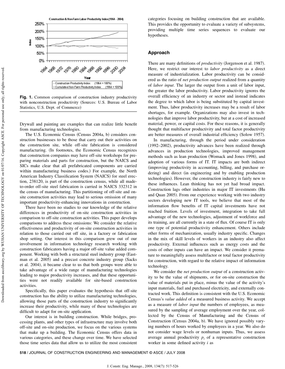 在过去的二十年中,一系列的研究表明,在建筑行业生产率一直较低,并且可能出现下倾(1985年艾伦;2001年Teicholz)。图1所示为制造业生产力的图表(2001年Teicholz),