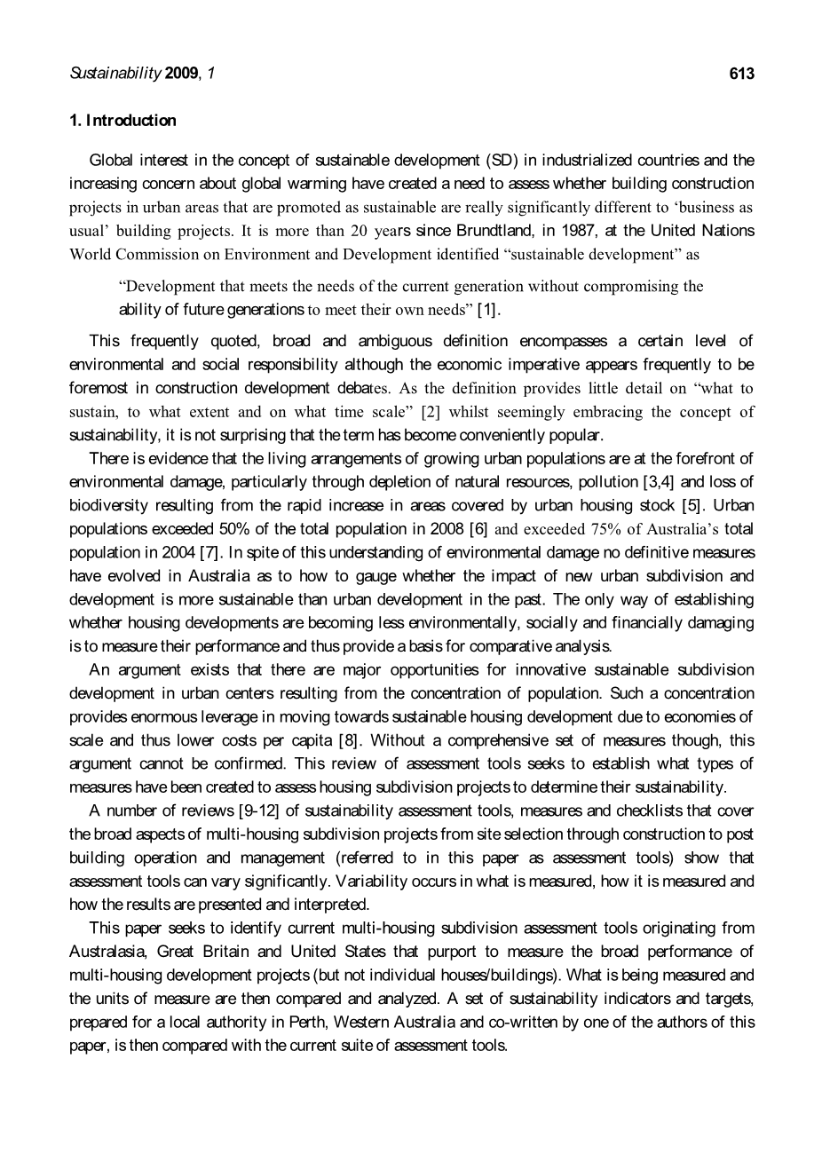 许多可持续发展评估工具、测量方法和清单的审查表明评估工具可以有很大的不同,这些评估工具、测量方法和清单涵盖了多住宅土地开发项目从选址到建设,再到建设后经营和管理的方方面面(在本文中作为评估工具的统称)。对于测量什么、如何测量以及结果如何呈现和解释是有所变化的。