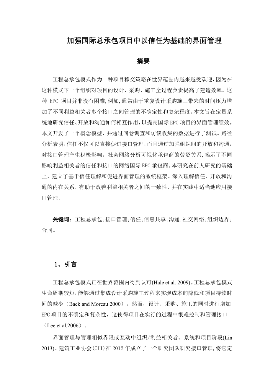 加强国际总承包项目中以信任为基础的界面管理外文翻译资料