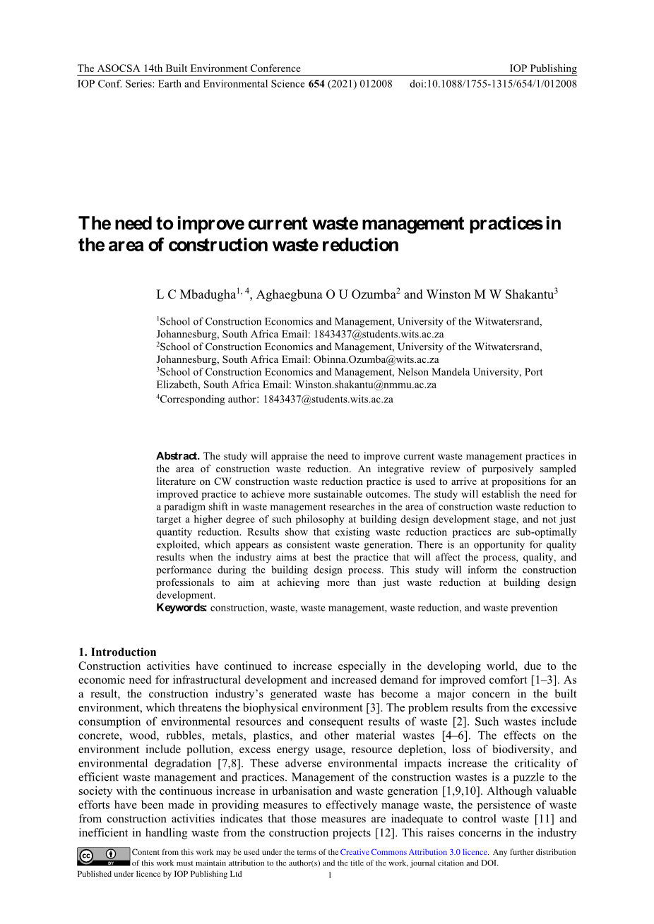 3School of Construction Economics and Management, Nelson Mandela University, Port Elizabeth, South Africa Email: Winston.shakantu@nmmu.ac.za