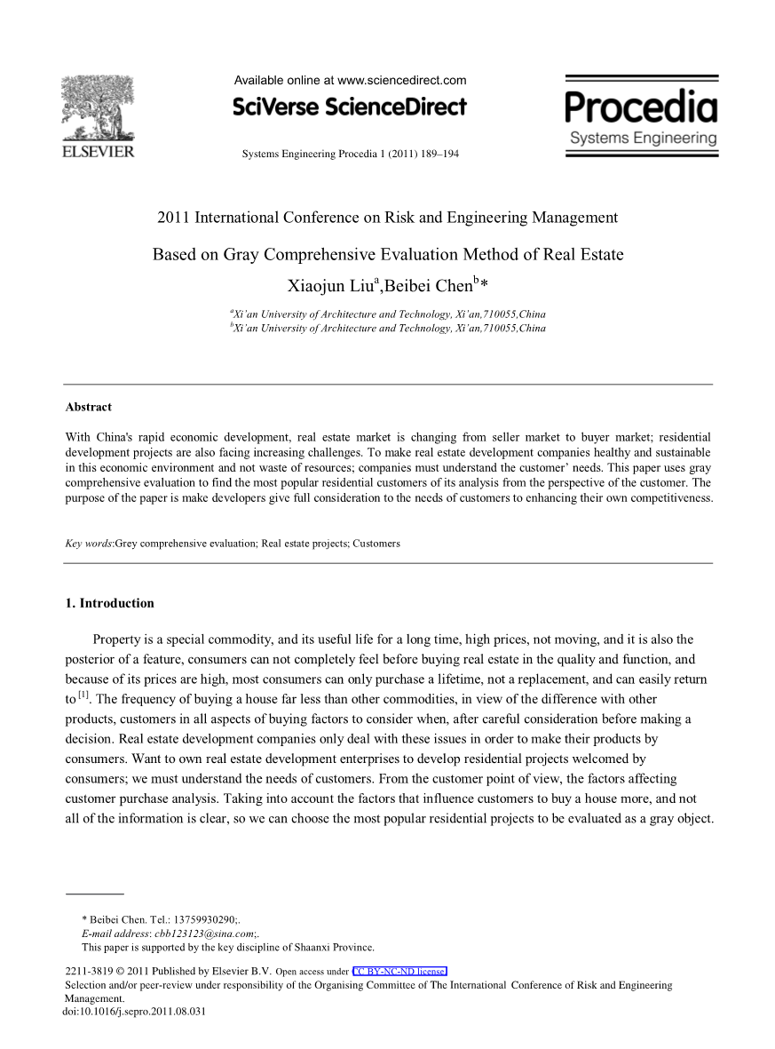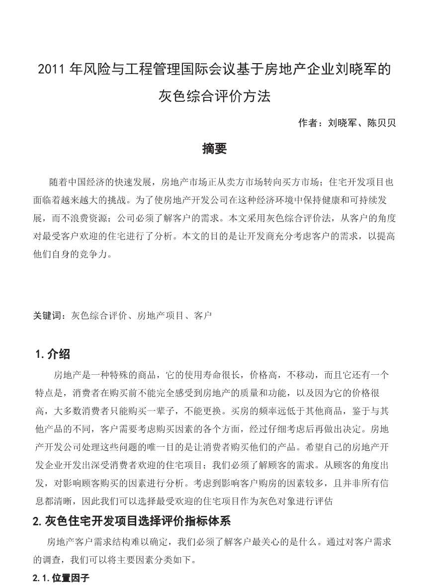 2011年风险与工程管理国际会议基于房地产企业刘晓军的灰色综合评价方法外文翻译资料