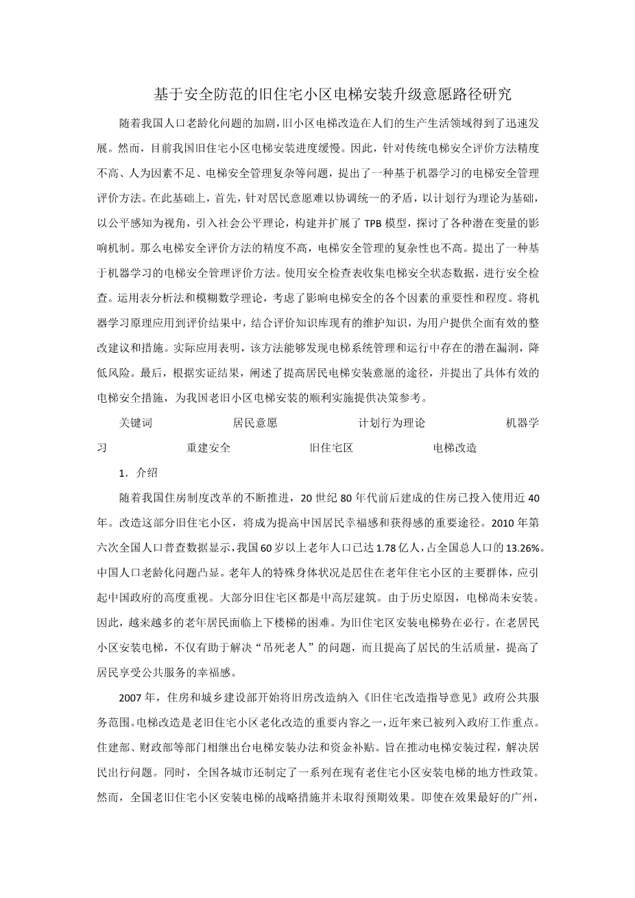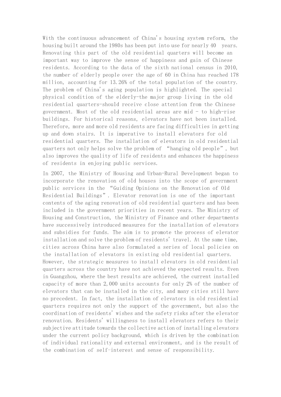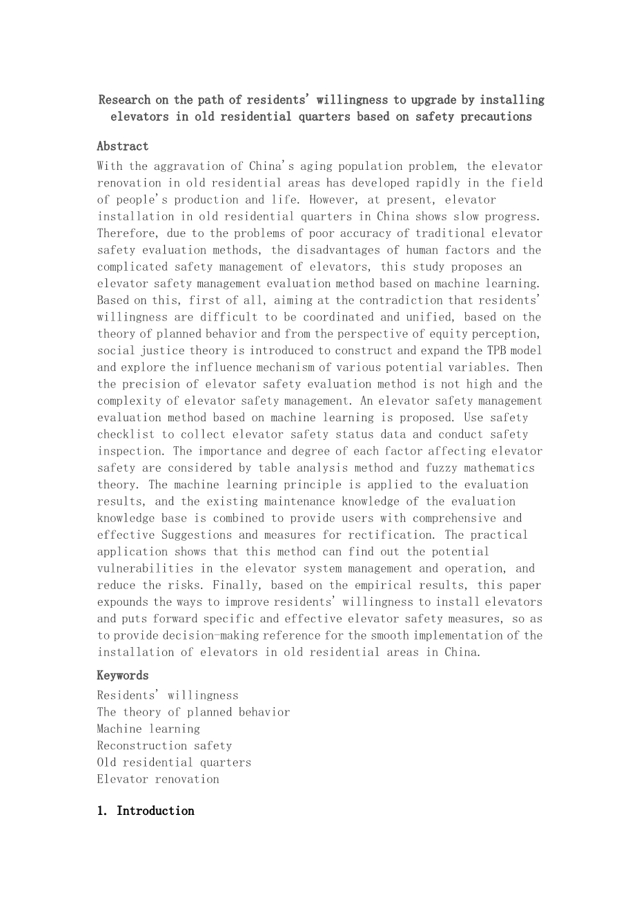 基于安全防范的旧住宅小区电梯安装升级意愿路径研究外文翻译资料 2023-08-23 15:01:49 英语原文共 12 页,剩余内容已隐藏,支付完成后下载完整资料 英语译文共 8 页,剩余内容已隐藏,支付完成后下载完整资料 资料编号:[608431],资料为PDF文档或Word文档,PDF文档可免费转换为Word 原文和译文剩余内容已隐藏,您需要先支付 30元 才能查看原文和译文全部内容!立即支付 发小红书推广免费获取该资料资格。点击链接进入获取推广文案即可: Ai一键组稿 | 降AI率 | 降重复率 | 论文一键排版 PREVIOUS NEXT 您可能感兴趣的文章 质量和成本控制:医疗保险及其他外文翻译资料 估算废物处理厂建设成本的技术外文翻译资料 新建项目建筑废物上游估算方法外文翻译资料 基于安全防范的旧住宅小区电梯安装升级意愿路径研究外文翻译资料 埃塞俄比亚项目的规划和融资外文翻译资料 物业管理外文翻译资料 工程造价管理的阶段外文翻译资料 建设项目风险管理过程有效实施的关键成功因素模型外文翻译资料 项目管理成本、时间和质量,两个最佳猜测和一个现象,是接受其他成功标准的时间了外文翻译资料 项目成本控制:它的工作方式外文翻译资料
