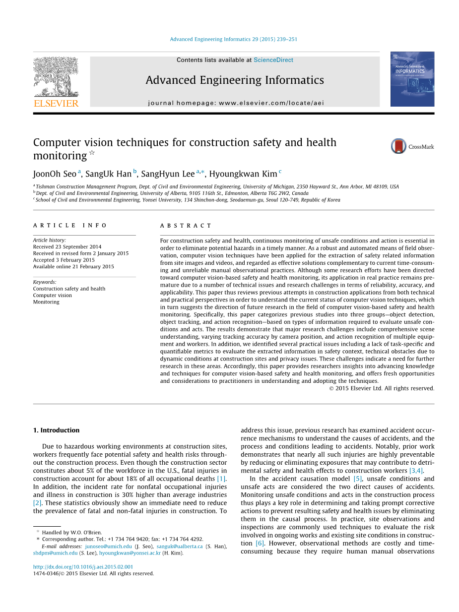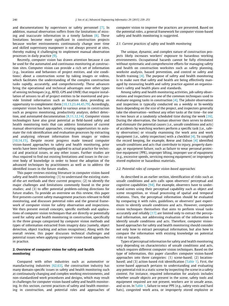 近年来,计算机视觉因其可用于建筑工地的自动化、连续化监测而受到广泛关注。计算机视觉通过拍摄图像或视频,可以提供一组关于施工现场的丰富信息(如项目实体的位置和行为,以及现场条件),有助于快速、准确、全面地理解复杂的施工任务。与其他类型的传感技术(如RFID、GPS和UWB)相比,这些技术需要在所有被监测的项目实体上安装传感器,并提供有限的信息(如位置数据),来这些技术自身的缺陷。由此可知,计算机视觉已经应用到建筑的各个领域,如进度监控、生产力分析、缺陷检测和自动化文档记录。计算机视觉技术作为一种基于现场的安全和健康监测工具,具有巨大的潜力,可以解决目前人工观察方法的局限性,通过从图像或视频中提取和分析相关信息,创造风险识别和评估过程的自动化机会。尽管最近在基于计算机视觉的安全和健康监测方法方面取得了进展,但以往的工作很少应用于实际的技术和任何其他实际实践的问题。因此,需要进行进一步的研究,找出现有知识体系中存在的局限性和问题,以便促进从业者采用先进的技术,并在今后的研究中解决已确定的问题。