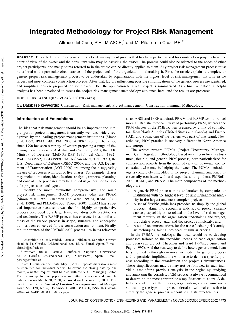 摘要:本文介绍了一个通用的项目风险管理过程,该过程已经特别针对建设项目业主和可能协助业主的顾问的观点。该过程也可以适应其他项目参与者的需求,文章中提到的许多要点可以直接应用于他们。任何项目风险管理流程都必须根据项目和开展项目的组织的具体情况量身定制。首先,文章解释了一个完整或通用项目风险管理流程,由风险管理成熟度最高的组织承担最大,最复杂的建筑项目。之后,确定了影响通用过程可能简化的因素,并且针对某些情况提出了简化。然后总结了对真实项目的应用。作为最终验证,Delphi法已经被创立用来评估这里解释的项目风险管理方法,并给出了结果。