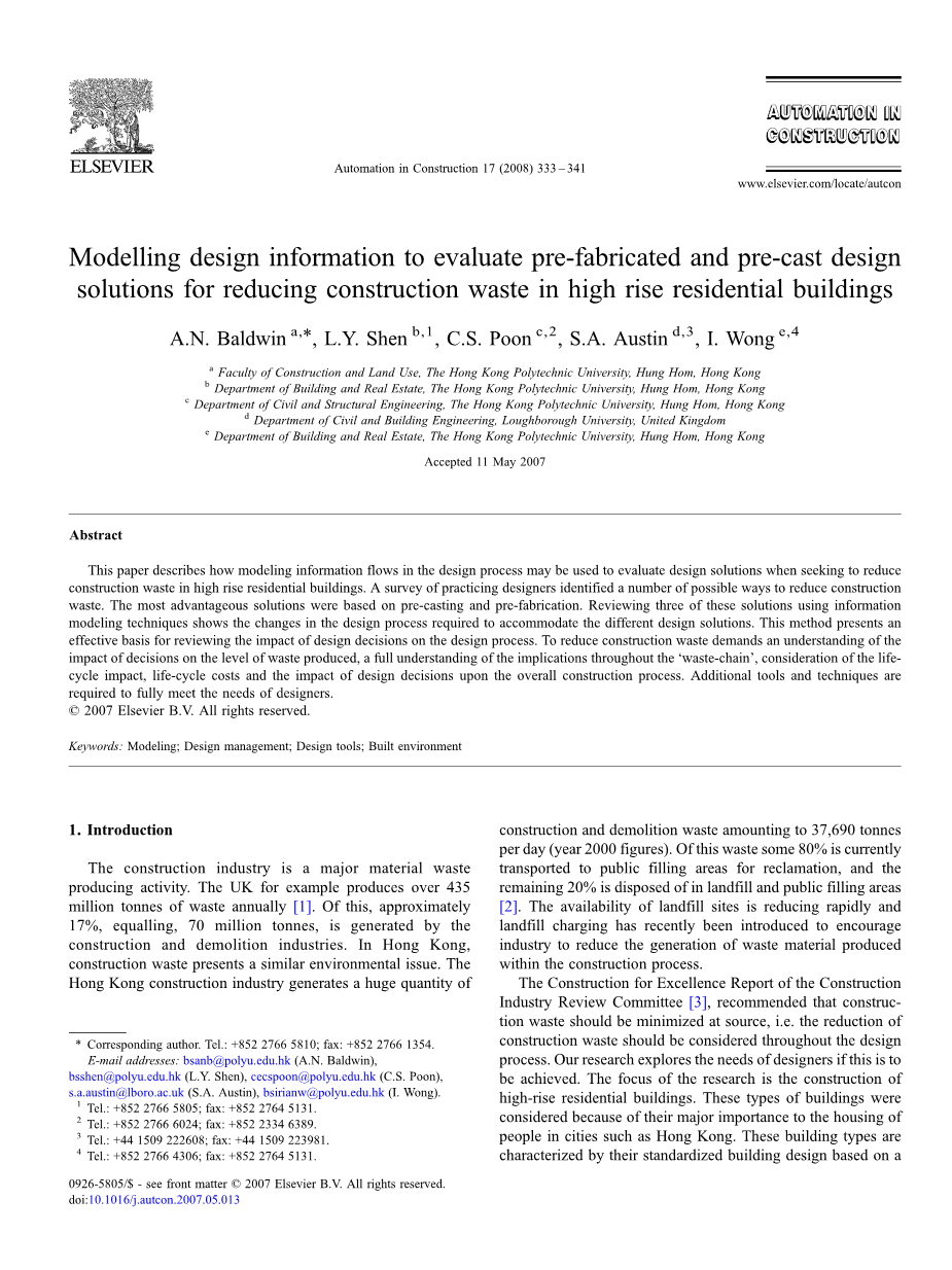摘要:本文描述了在寻求减少高层住宅建筑中的建筑垃圾时,设计过程中的建模信息流如何用于评估设计解决方案。对实践设计师的调查确定了一些减少建筑垃圾的可能方法。最有利的解决方案基于预铸和预制。使用信息建模技术审查其中三个解决方案,可以看出适应不同设计解决方案所需的设计过程中的变化。该方法为审查设计决策对设计过程的影响提供了有效的基础。要减少建筑垃圾,需要了解决策对产生的废物水平的影响,充分了解整个“废物链”的影响,考虑生命周期影响,生命周期成本和设计的影响对整个施工过程的决定。需要额外的工具和技术才能完全满足设计人员的需求。