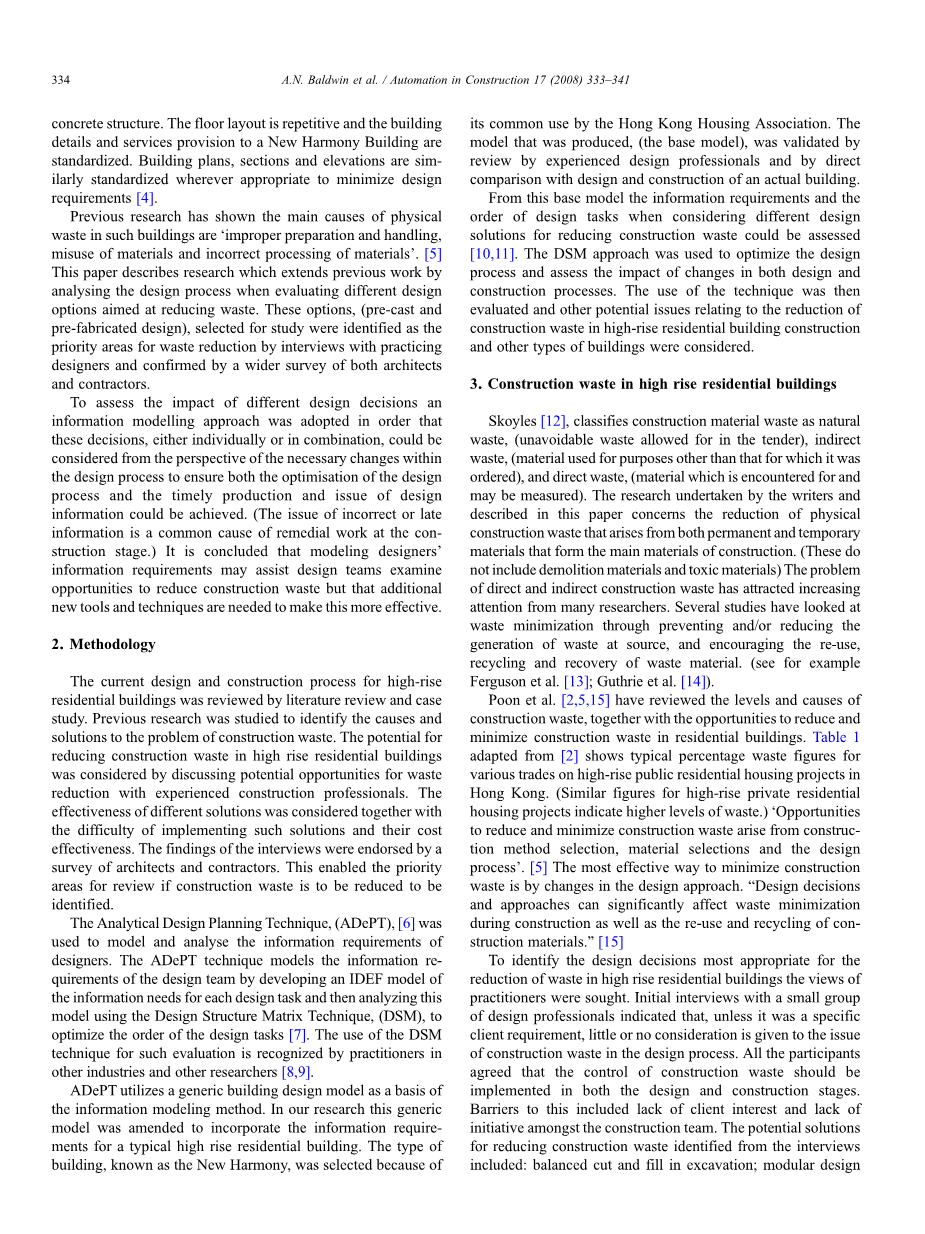 ADePT使用通用建筑设计模型作为信息建模方法的基础。在我们的研究中,对这种通用模型进行了修改,以纳入典型高层住宅建筑的信息要求。由于香港房屋协会的共同使用,选择了被称为新和谐的建筑类型。所生产的模型(基础模型)通过经验丰富的设计专业人员的审查以及与实际建筑的设计和建造的直接比较来验证。从这个基础模型中可以评估信息要求和设计任务的顺序,当考虑减少建筑垃圾的不同设计方案时[10,11]。DSM方法用于优化设计过程并评估设计和施工过程中变化的影响。然后评估了该技术的使用以及与减少高层住宅建筑中的建筑垃圾有关的其他潜在问题和其他类型的建筑物被考虑。.
