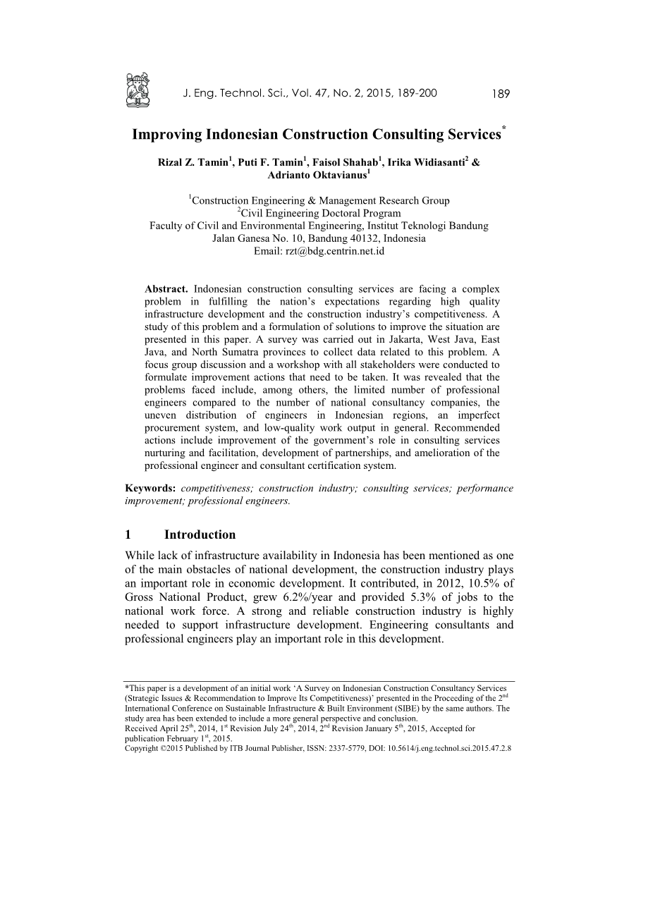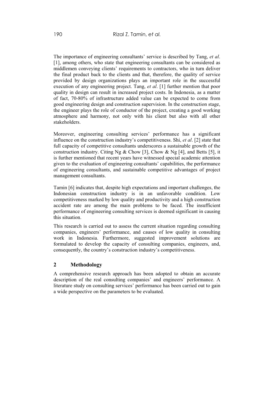 唐等人阐述了工程咨询服务的重要性。[1]除其他外,他们指出,工程顾问可被视为向承包商传达客户要求的中间人,承包商反过来又将最终产品送回客户,因此,设计组织提供的服务质量对任何工程项目的成功执行都起着重要作用。Tang等人。[1]进一步提到设计质量差可能导致项目费用增加。在印尼,事实上,70%至80%的基础设施增值可以预期来自良好的工程设计和建设监督。在施工阶段,工程师扮演项目的指挥者的角色,创造良好的工作氛围和谐,不仅与他的客户,而且与所有其他利益相关者。此外,工程咨询服务的绩效对建筑业的竞争力也有重要的影响。SHI等人。[2]指出有竞争力的顾问的全部能力突出了建筑业的可持续增长。引用Ng和Chow3、Chow和Ng[4]和Betts[5]的例子,进一步提到近年来在学术上对工程顾问能力的评价、工程顾问的业绩和项目管理顾问的可持续竞争优势给予了特别的关注。Tamin[6]指出,尽管有很高的期望和重大的挑战,印度尼西亚建筑业仍处于不利的状况。以低质量、低生产率为特征的低竞争力和较高的施工事故率是当前面临的主要问题。工程咨询服务的不足被认为是造成这种情况的重要原因。本研究旨在评估印尼顾问公司的现状、工程师的表现及顾问工作质素低下的原因。此外,还制定了建议的改进办法,以发展咨询公司、工程师的能力,从而提高该国建筑业的竞争力。