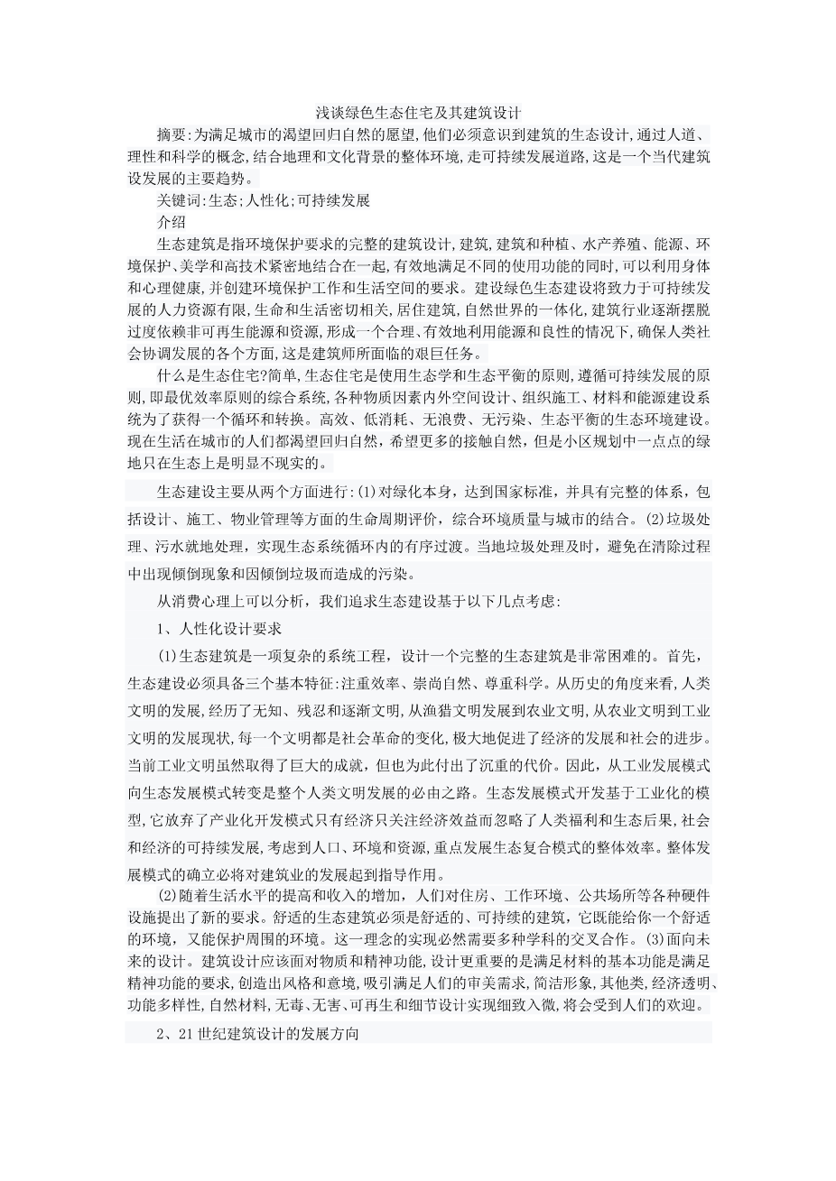 Abstract: to meet the city's desire to return to natural desire, they must realize the ecological design of the building, through the humane, rational and scientific concept, combined with the overall environment of geographical and cultural context, the path of sustainable development, it is a main trend of contemporary architectural design development.