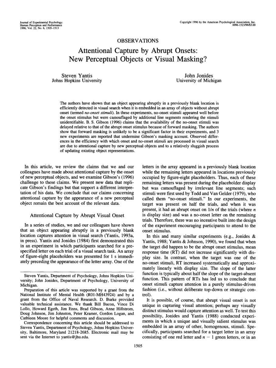 在本文中,我们回顾了我们和我们的同事关于新感知对象发生时注意力捕获的主张,并且我们检查了Gibson (1996)对这些主张的挑战。我们提供的新数据可以复制Gibson的研究结果,但支持对他的数据进行不同的解释。我们的结论是,我们关于通过新感知对象的出现进行注意捕获的主张仍然是相关数据的最佳说明。