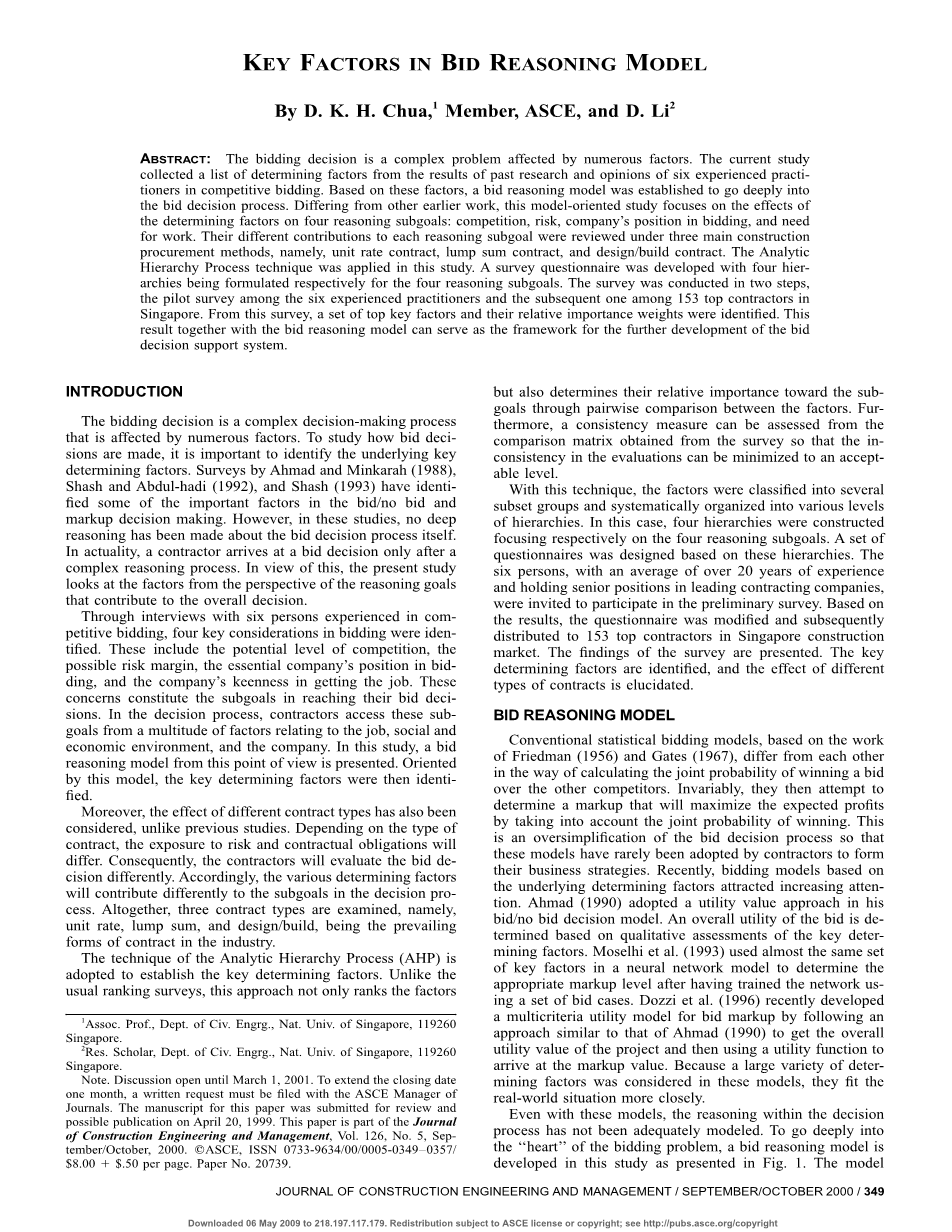 摘要:投标决定是一个受多种因素影响的复杂问题。目前的研究从过去的研究结果和六个有经验的从业人员在竞标中的意见中收集了一系列决定因素。在此基础上, 建立了投标推理模型, 深入到投标决策过程中。与其他早期工作不同的是, 这项以模型为导向的研究侧重于决定因素对四个推理子目标的影响: 竞争、风险、公司在投标中的地位和工作需求。在单位费率合同、一次总付合同和设计/建造合同三个主要的施工采购方法下, 对它们对每个推理次级目标的不同贡献进行了审查。本研究采用了层次分析法技术。针对四个推理子目标, 分别编制了四个层次的调查问卷。调查分两个步骤进行, 即对6名有经验的从业人员进行试点调查, 随后在新加坡153名顶级承包商中进行。从这项调查中, 确定了一组最关键的因素及其相对重要性权重。该结果与投标推理模型一起, 可作为进一步开发投标决策支持系统的框架。