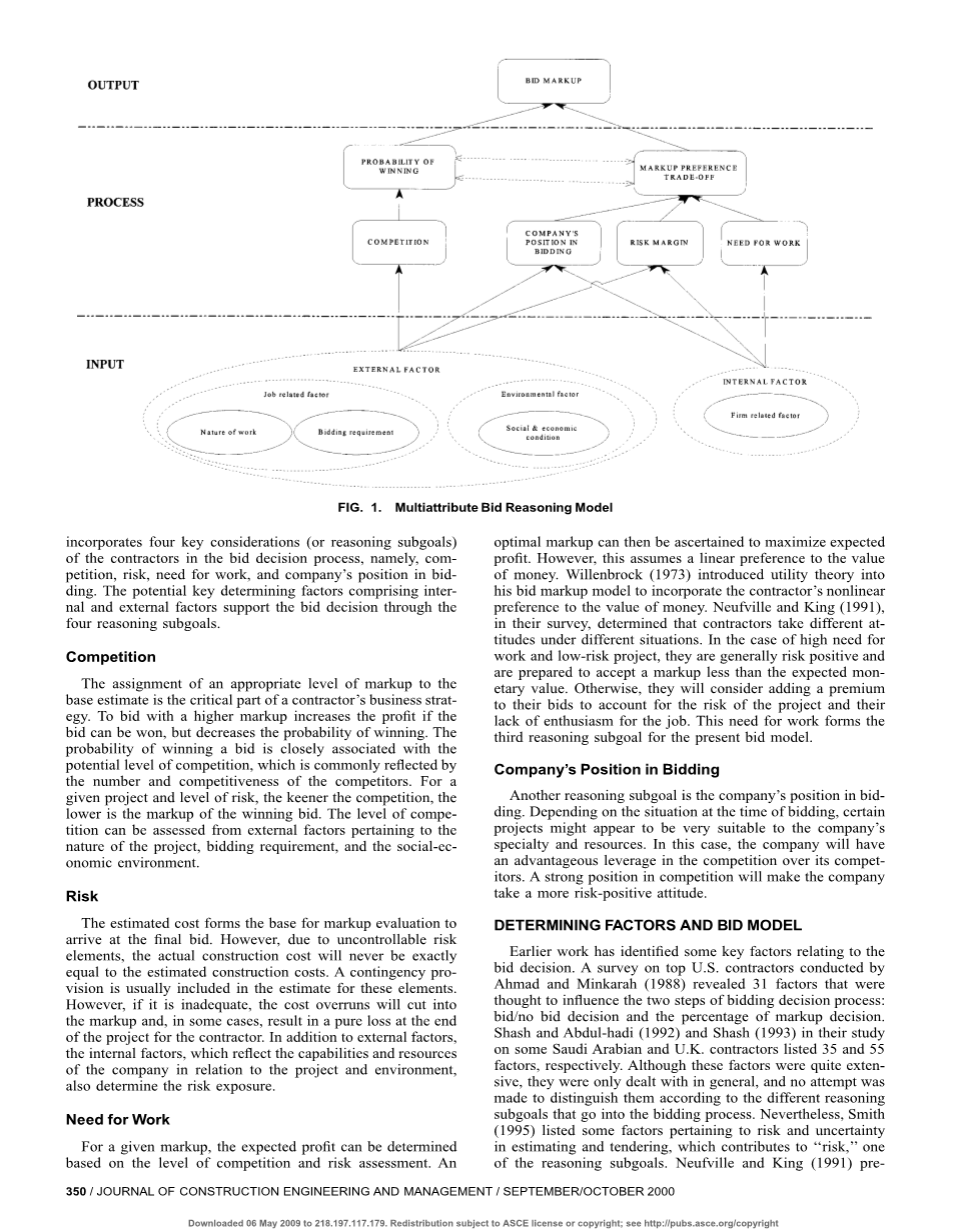 基于弗里德曼 (1956年) 和盖茨 (1967年) 工作的传统统计投标模型在计算与其他竞争对手共同中标的概率方面存在差异。然后, 他们总是试图确定一个加价, 通过考虑到共同获胜的概率, 最大限度地提高预期利润。这是对投标决策过程的过度简化, 因此承包商很少采用这些模式来形成其业务战略。近年来, 基于潜在决定因素的竞价模式越来越受到人们的关注。Ahmad (1990年) 在他的投标/无投标决策模型中采用了效用价值方法。根据对关键的关键采矿因素的定性评估, 取消了投标的总体效用。Moselhi 等人 (1993年) 在训练了网络使用一组投标案例后, 在神经网络模型中使用了几乎相同的一组关键因素来确定适当的加成水平。Dozzi 等人 (1996年) 最近开发了一种用于标价的多标准实用新型, 采用了类似于 Ahmad (1990) 的方法, 以获得项目的总体效用值, 然后使用效用函数得出加价值。由于这些模型考虑了各种各样的决定因素, 因此它们更符合实际情况。