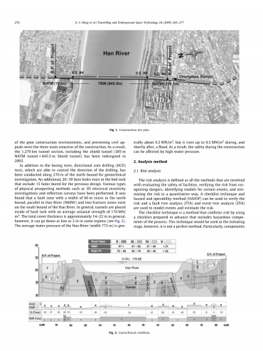 在钻孔试验的基础上,在北向270米进行了定向取心(DCD)试验,以控制钻孔方向,进行岩土工程勘察。此外,在床层岩石中还存在20-30个钻孔,其中包括之前设计的15个钻孔。开展了三维电阻率法、反射法等多种物理勘探方法。发现北界存在一条宽度为60m的断裂带,与汉江平行(N80W),汉江南界存在两条断裂带。一般情况下,隧道位于坚硬岩石内部,平均单轴强度为170 MN/ m2。总覆盖层厚度一般约为14-22 m,但在某些区域可低至2 m(图2)。汉江(宽773米)的平均水压一般在0.3 MN/ m2左右,但在洪涝期间和洪涝后不久就会上升到0.5 MN/ m2。因此,高水压会影响施工过程中的安全。