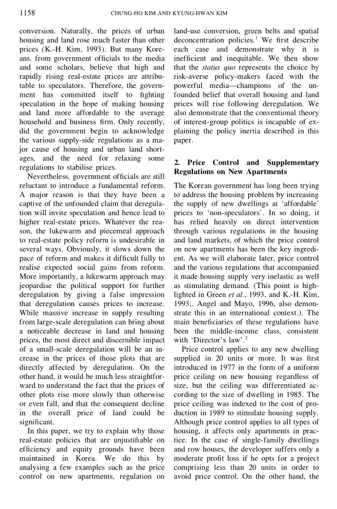 长期以来,韩国政府一直在努力解决住房问题,以“可承受”的价格增加新住宅的供应给“非投机者”。在这一做的过程中,它很大程度上依赖于住房和土地市场的各种法规的直接干预,而新公寓的价格控制一直是关键因素。稍后我们将详细说明,价格控制和伴随它的各种法规使住房供应非常缺乏弹性,同时也刺激了需求。(这一点在Green et-al,1993和K.-H.Kim,1993中都被强调过,Angel和Mayo,1996也在国际背景上证明了这一点。)这些规定的主要受益者是中等收入阶层,符合“董事法”。