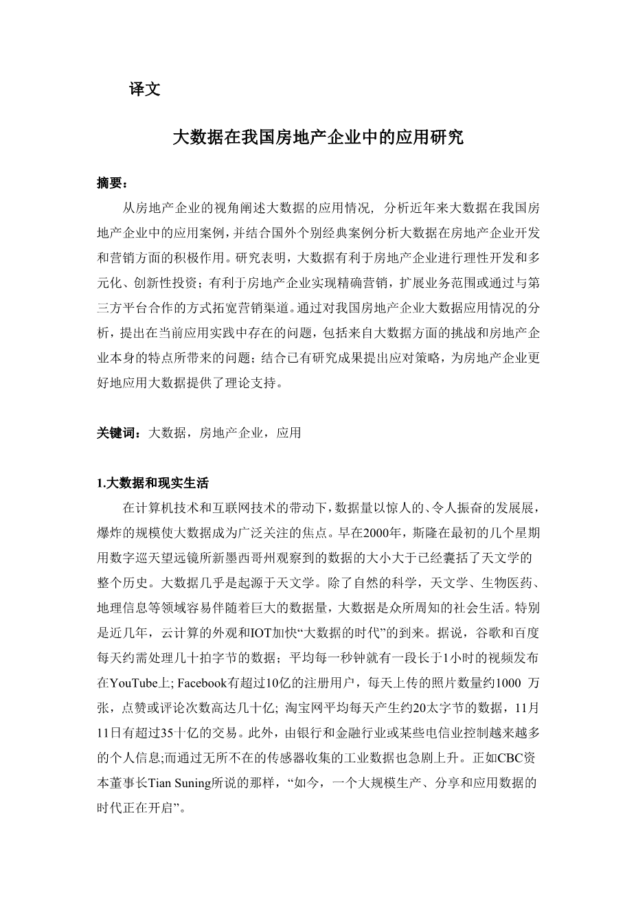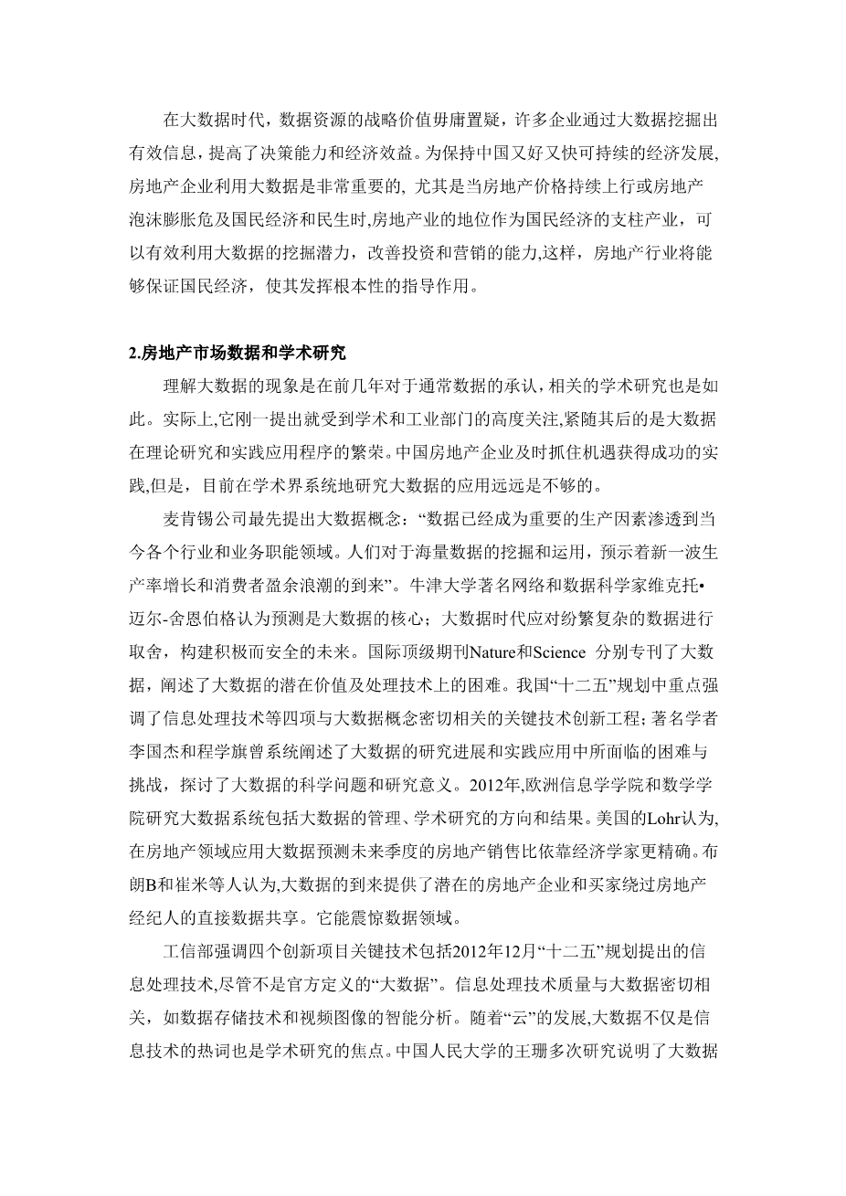 To understand thoroughly the big data phenomenon is late in last several years relative to the recognition of usual data. So is the related academic research. Actually, it received high attention from academic and industrial sector at once presented, followed by the big data boom both in theory research and practical application. Chinese property enterprises seize opportunities in time making successful practices, though the systematic research about the applications in a the big data in academia is not sufficient so far.
