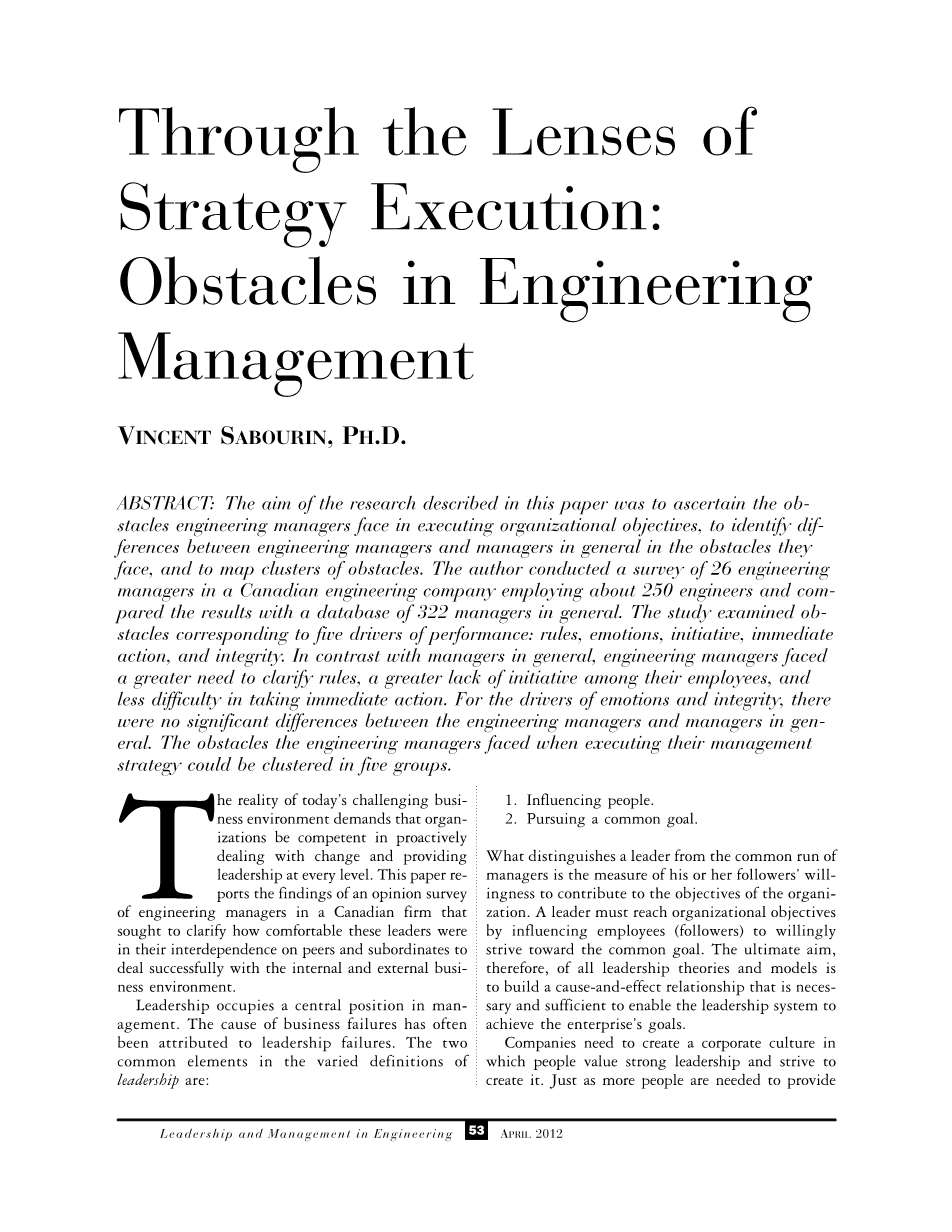 1.工程管理人员报告说,与一般管理人员相比,最重要的障碍是缺乏主动性。大多数工程管理人员认为,他们面临的最大挑战是与员工一起将自己的目标转化为具体的项目,提高雇员在实现目标方面的责任感,以及实行权力下放。