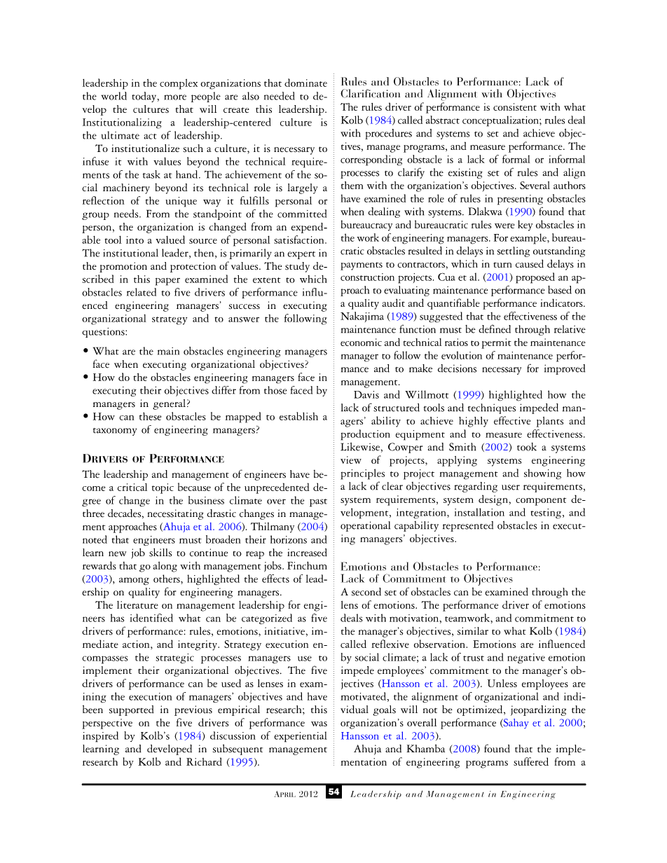 关于工程师管理领导能力的文献已经确定了绩效的五大驱动因素,分别是:规则、情感、主动性、立即行动性和诚实。战略执行包括管理者用来实现其组织目标的战略过程。绩效的五种驱动因素可以作为检查经理目标执行情况的镜子,并在先前的实证研究中得到支持,这一观点在五个方面都得到了支持。绩效的驱动因素是由Kolb(1984)关于经验学习的讨论启发而来的,并由Kolb和Richard(1995)在随后的管理研究中发展起来。