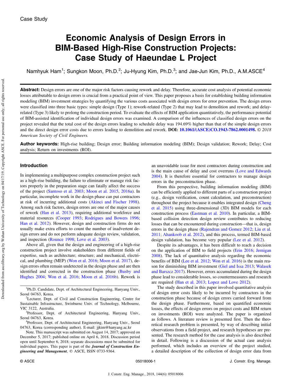 尽管进行了大量的研究,但现场工作人员需要知道的由于设计误差造成的实际成本仍然不得而知,因为它们没有在公司层面上进行正式计算,也甚少在项目层面上进行计算。即使试图发现设计误差,也因施工项目规模和复杂性的不断增加只停留在在施工开始前阶段而已。这增加了在传统的二维计算机辅助设计(CAD)建筑图纸中检测误差的难度,以通过广泛应用BIM减少设计误差、设计变更和返工来努力解决这个问题。因此,本文通过分析一个基于BIM的建设项目实例,对该项目设计误差造成经济影响进行定量分析。