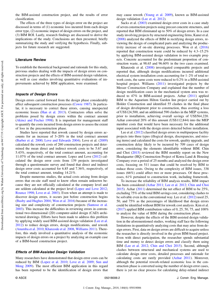 本文所述的研究包括定量分析承包商在施工阶段由于设计阶段带来的设计误差而可能产生的设计误差成本。在量化经济损失的基础上,分析了设计误差对项目成本和投资回报率(ROI)的影响。本文组织如下:首先对文献进行综述,然后通过对实地观测资料的描述,提出理论研究问题,并提出研究假设。详细介绍了案例分析的研究方法,紧接着是实际执行案例分析的讨论,其中包括对所研究项目的概述,这个BIM项目设计误差集合的详细描述以及误差分类的结果。