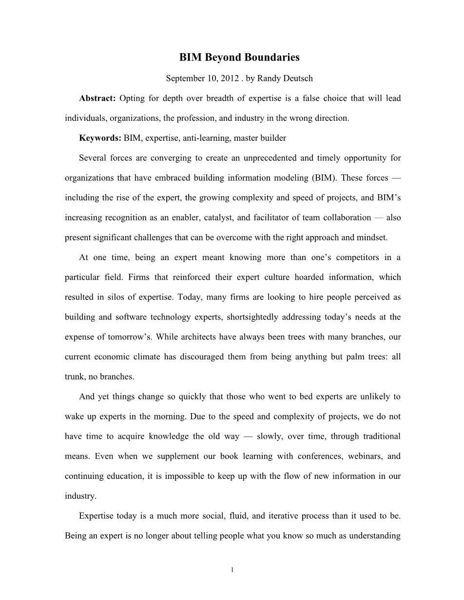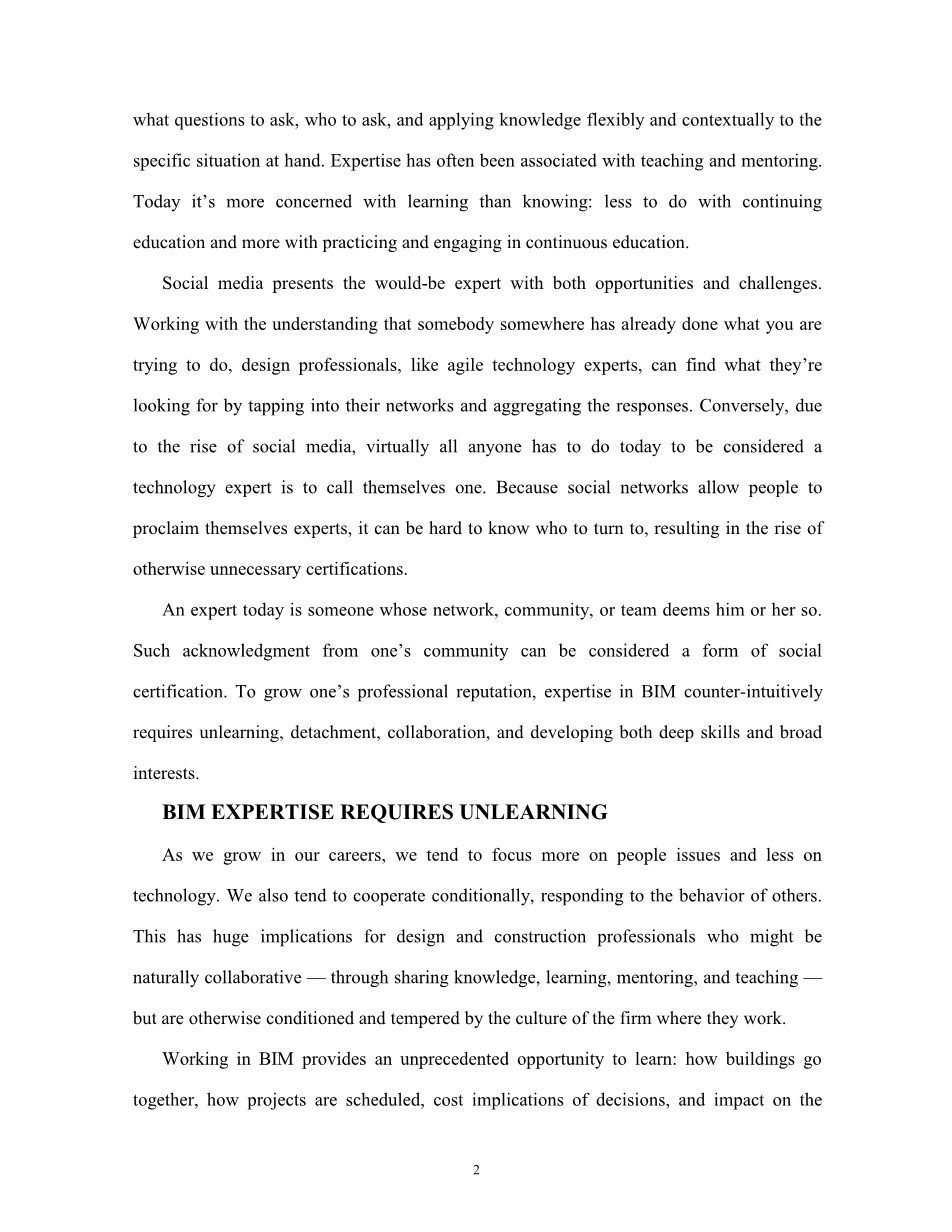 今天的专家是这样一个人,他的网络、社团或团队认为他是一个专家。这样的来自一个社团的认同,被认为是一种社会证明。和我们的直觉相反,为了增加职业声誉,BIM 领域的专家技能需要的是反学习、超越和合作,同时发展深度技术和广阔兴趣。