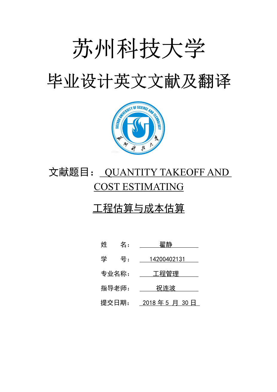 文献题目: QUANTITY TAKEOFF AND COST ESTIMATING