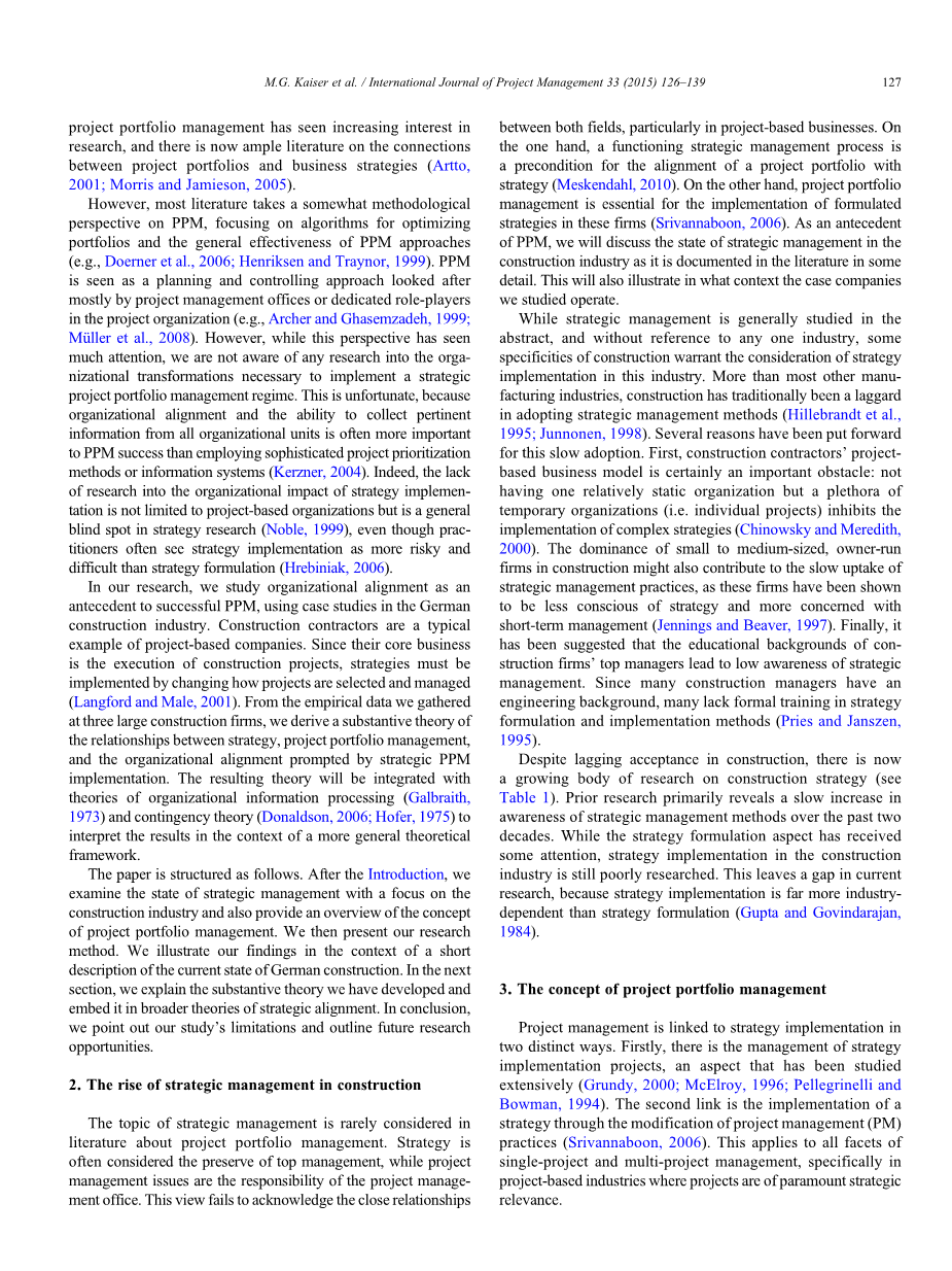 在我们的研究中,我们使用德国建筑行业的案例,将组织结构调整作为成功PPM的前身进行研究。 建筑承包商是项目型公司的典型例子。由于他们的核心业务是执行建设项目,所以必须通过改变项目的选择和管理来实施策略(Langford and Male,2001)。 根据我们在三家大型建筑公司收集的实证数据,我们得出了战略、项目组合管理和由战略PPM实施所促成的组织结构之间关系的实质性理论。由此产生的理论将与组织信息处理理论(Galbraith,1973)和应急理论(Donaldson,2006; Hofer,1975)结合在一个更一般的理论框架的背景下来解释结果。