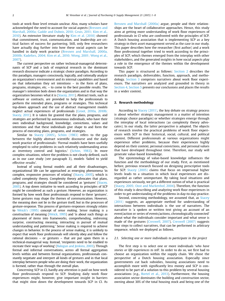 基于价值导向的知识的认识论影响我们研究的功能和方法论。首先,如前所述,以前的研究侧重于设计SCP的规范性工具。Stacey (2005)声称,过多侧重于非客观会导致一种情况,即本地经验被忽略为不重要的情况。通过认真考虑当地的情况和经验,我们得到了一个不同的概念,——什么是实际可行的(Stacey,2005;Oost和Markenhof,2004)。因此,本研究的功能是描述和分析工作层面的经验,以了解日常实践中的问题。