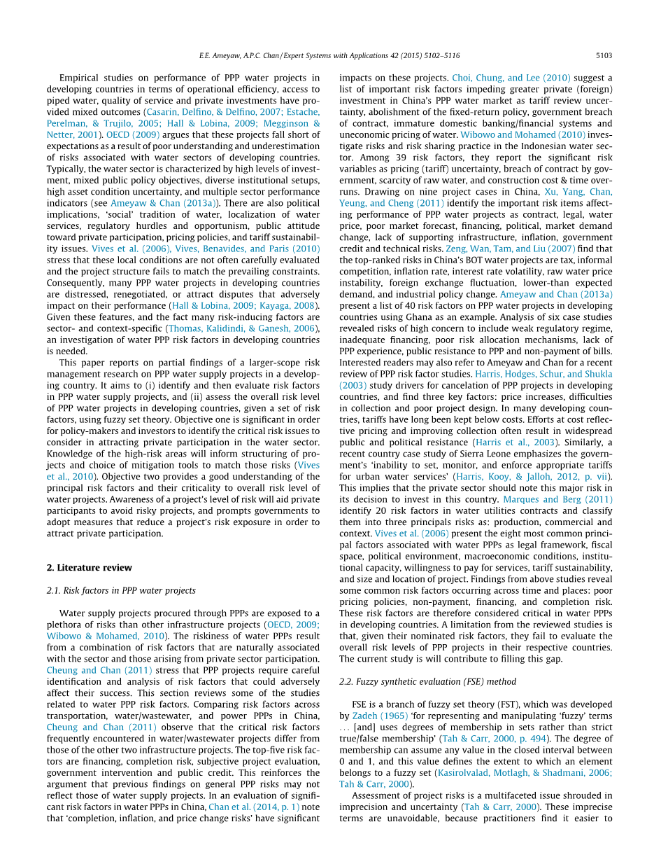 关于发展中国家PPP运营效率,获取自来水,服务质量和私人投资方面绩效的实证研究提供了不同的结果(Casarin,Delfino,&Delfino,2007; Estache,Perelman和Trujilo,2005年; Hall&Lobina,2009; Megginson&Netter,2001)。经合组织(2009)认为,由于对发展中国家水部门相关风险的理解不足和低估,这些项目未达到预期。通常,水部门的特点是投资水平高,公共政策目标混杂,机构多样资产配置不确定性和多部门绩效指标(见Ameyaw&Chan(2013a))。还有政治含义,水的“社会”传统,供水服务本地化,监管障碍和机会主义,公众态度,私人参与,定价政策和关税可持续性问题。 Vives等人(2006),Vives,Benavides和Paris(2010)强调,这些当地条件往往没有经过仔细评估,项目结构也不符合当前的限制条件。因此,许多发展中国家的PPP项目受到困扰,重新谈判或吸引(Hall&Lobina,2009; Kayaga,2008)。鉴于这些特征,事实上许多风险诱发因素都是部门和特定背景的(Thomas,Kalidindi,&Ganesh,2006),发展中国家水务PPP风险因素调查本文报告了发展中国家PPP供水项目的大范围风险管理研究的部分结果。它旨在(i)确定并评估PPP供水项目中的风险因素,(ii)评估发展中国家PPP项目的整体风险水平,给定一组风险因素,采用模糊集合论。目标之一对于决策者和投资者来说很重要,以确定在吸引私营部门参与水务部门时需要考虑的关键风险问题。高风险领域的知识将为项目的结构设计和选择适合这些风险的减灾工具提供信息(比韦斯等人,2010)。目标二很好地理解了水利工程总体风险水平的主要风险因素及其危害程度。意识到项目的风险水平将有助于私人参与者避免风险项目,并促使政府采取行动,减少项目的风险,以吸引私人参与。